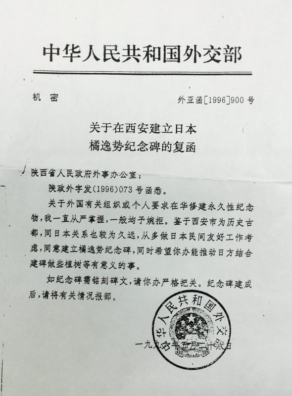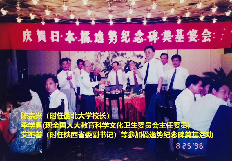 日本平安时代,(即中国唐代)是一個承上启下,繼往開來的時代,是日本書道史上的黃金期。在這個時代,初期湧現了平安三筆,即空海、嵯峨天皇,橘逸勢;橘逸勢于804年和空海一起渡唐到长安(西安),向中國書法家學習。原爱知大学学长久曽神昇考证,留学的地点在現今西安西北大学,当时由久曽学长与日本書道艺术学院(院长寺泽秀)发起,联合国际書画协会(会长敷山杉石)共同出资筹建橘逸勢紀念碑,我时任国际书画协会副会长,这件事交由我具体运営联系,我对日本书家畄学中国这段历史很感兴趣,于是满怀热情,穿梭于东京、西安之间,为建立橘逸勢纪念碑而奔忙!我亲身体验了建设纪念碑等全过程。这过程也并非容易,在国內建立外国人纪念碑必須首先取得中国外交部許可批文,为取得许可,真的跑了好几次北京。地方领导及西安的各个关联部门也要一一沟通,纪念碑从奠基式到落成費了些时日,落成后,日本许多书道団体到碑前曕仰並和当地书法家交流,碑上刻有国际书画协会的名字,每逢有去西安的机会,我都到纪念碑前靜立,回忆这段经历。