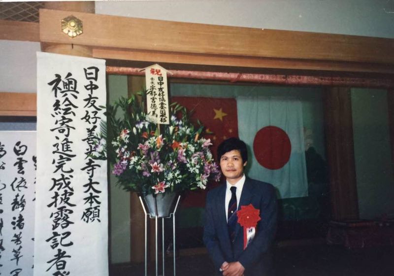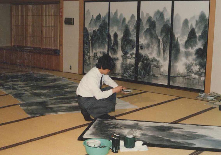 我是1988年來到日本的,的确在出国前我的事业和生活正在上升时期,创作连连有收获,加入了中国美协,转为国家干部,担任单位的领导,作品由画廊銷售,生活上有较好的经济基础。跟随出国热潮来日本,也许是冲动,也许是好奇心躯使,也许是內心不安于现状,总想探求新的东西,最能鼓动自己的说词是:上世纪初,许多致力于新文化新艺术的求索者,如鲁迅、郭沫若、李叔同、何香凝、傅抱石、高剑父、陈师曾、丰子恺等走出国门,远渡东瀛,海外求索,融汇贯通,载誉归国,励精治图,掀起时代新風,开创了我国近代文化艺术史的丰功伟绩。我们应踏着艺术先輩的足迹,不断探索,开拓艺术新境界!來到日本的初期阶段是艰难困苦的,相信來日的同道们都有所体会,就学、打工、簽证等都是实际的问題,就不言而喻了。虽然我短期生活沒有问题,不用像其他人那样要到攴馆洗碗谋生活,但是孤身一人在异国他乡,语言迟迟学不会,尽管认识些日本朋友也难以交心融合,沒有同道朋友的交流,沒有目标,找不到机会发展,寂寞、孤独、渺茫等精神的煎熬更需要毅力堅持,好在经过下乡插队的磨练,还算挺住了苦闷的困境,如此熬了约一年,总算有了一个机会,被誉为日本三大佛教城市之一的长野市。当时日本全国有名寺院之列的长野善光寺大本愿要重新绘制一系列障壁画,要求找一位有传统中囯画功底,山水、花鸟、书法兼能的中国画家,正在审阅其他参选画家的作品。一位在外务省工作的日本友人告訴我这个消息并叫我准备些书画作品,要推荐我去参加选拔。不久便有了结果,寺方在阅览各人的作品后选择了我,请我到寺院看現场,我明白这次创作的重要。全身心投入。构思绘制障壁的內容。连搜集素材到构思创作,大概用了约三个月的时间完成了四组26幅障壁画。完成发表后,有日本经纪人带着我到全国各地办个人画展。由于善光寺大本願是日本全国著名寺院之一,有1400歷史,每年來此観光者逾600多万人次。长野善光寺在日本几乎妇儒皆知。在我的个展上,日本经纪人都不用提我的职称,只介绍我是为善光寺画障壁画的画家,便有很多客人购藏我的作品,我占了善光寺的光,改变了居住日本的現状,很快便將我的太太和女儿接來日本,女儿进入地方一流的学校读书,太太协助我的艺术工作,促进了事业的发展。