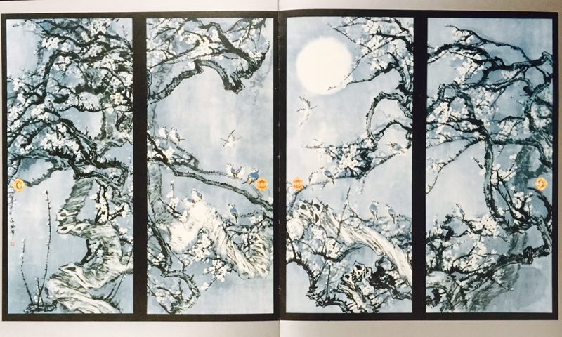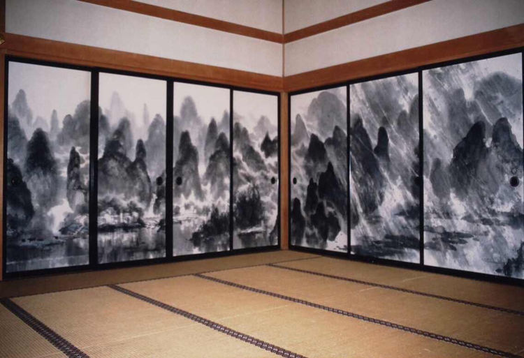 在构思善光寺的障壁画时动了点心思,四组作品分別是,桂林之雨(14幅)、鹤之舞(4幅)、寒林梅雀(4幅)、唐诗书法(4幅),4组作品中,「桂林之雨」是重点,我带着思乡的情绪创作这组作品,我画桂林雨景是因为桂林下雨时变化莫测,或许每人都有过这样的体验,这个山头下雨,那个山头却是晴的,桂林的烟雨漓江总帶有几分神秘的感觉,山峰在䑃胧的烟雨中若显若现,看不清远山的真面目,会使人产生更多的想象。当雨將停时,烟雾缭绕,变化神奇。作品〈桂林之雨〉完成后裝裱在寺院禅殿障壁,信者们面对障壁修禅,沈浸在新奇的意境中。为了表現雨景的微妙変化,保持湿润韵存的效果,我尝试水乳交融的方法,水墨中调合少量牛奶,將干时洒水,営造风雨的气氛。作品〈鹤之湖〉也用了少许特別技法,鹤群背景湖水倒影,用花青调入胶水泼成山形,山形上撒盐粒,干后有雨点的效果。四屛书法都是选择与寺院內容关联的唐诗,〈梅林宿雀〉也有诗的意境,这样四组作品的氛围都与寺院的环境吻合,得到寺方和各界人士的认可。