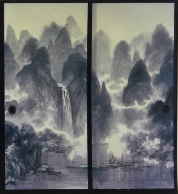 人们常说桂林山水甲天下,好看却不好画。因为善光寺的障壁画是十六幅分割的壁障,每幅画既要独立成篇,各有主旨,而整体又要通篇连贯,融汇一气。杨永琚创作的主题命名为“桂林之雨”,这是他经过多少个夜晚而深思熟虑之后的一种智慧。因为“雨”,山水就变得灵动起来,从初晴,云起,微雨到暴雨,组合山水的面貌,性情的变化,就为画家提供了无穷的表现空间和内容,这里既有“水光潋滟晴方好”的明媚,又有“山色空蒙雨亦奇”的幽谧,桂林山水就是这样多方位多视角的把“美”呈现在观众面前。据说杨永居在兼点带染,彩墨交融的创作过程当中,还大胆地使用了牛奶做染料。“桂林之雨”成功了,他的创造和展出在日本各界引起了强烈的反响,有许多日本友人在观看之后纷纷去中国旅游。那就让我们一起来分享杨永琚先生在艺术上的突破和成就吧。