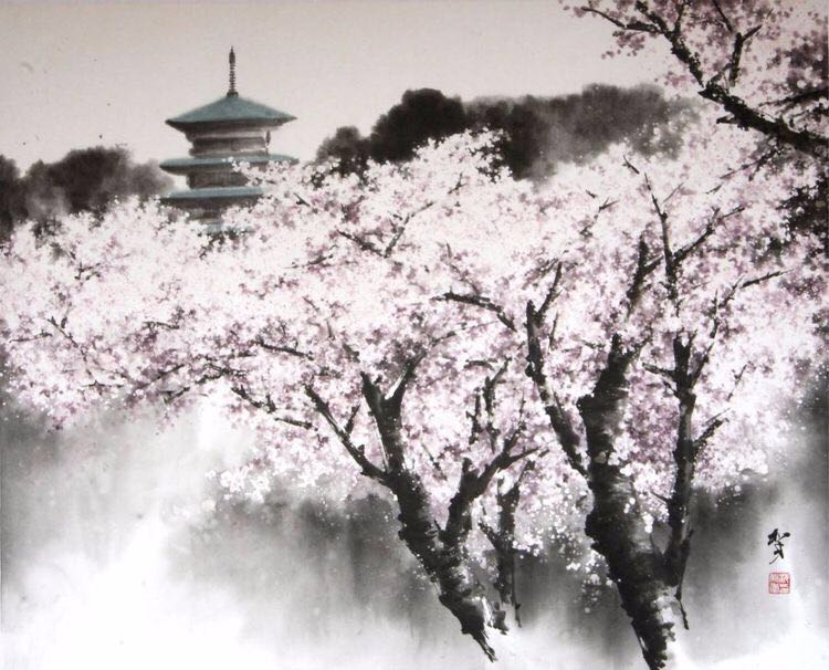 沈和年:30年前的春天第一次来日本看到的桜花,完全不同于传统绘画中的桜花,真美!想试着画一直到画出这感觉其实化了十多年。桜花的表现主要是用了一种新材料"留白剂"。