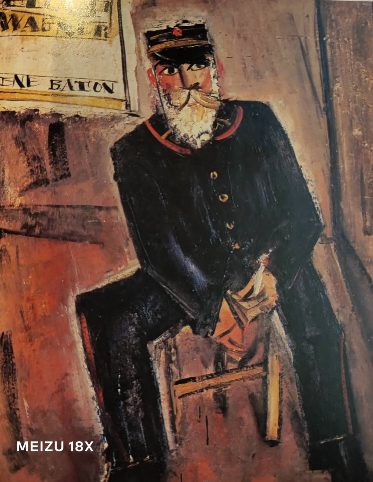 《邮差》(1928年)是佐伯最后的作品,1928年3月,佐伯因在小雨中作画引发感冒,使原本就羸弱的身体每况愈下。此时,偶然到访的邮差再次激发了佐伯拿笔作画的强烈的创作欲望。佐伯邀请邮差做他的模特,佐伯当天就完成了该作品。邮差倾斜着上半身坐在椅子上、左右两脚以及脸部的轮廓,佐伯统统使用大量的直线,从强有力的构图中我们可以感受到被病魔侵袭却执着于绘画的佐伯焦躁又不肯甘心的复杂心情。