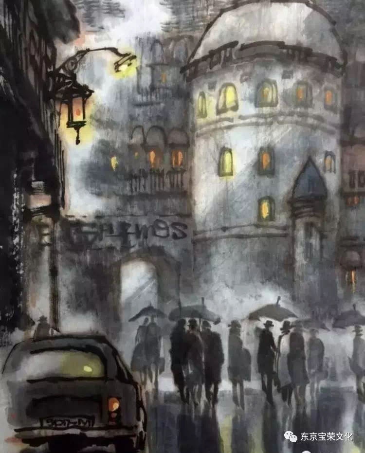 李永亮:乘坐“日本丸”游轮,王子江周游了欧洲列国。为了把中国传统的水墨和西方绘画巧妙地结合起来,也为了尝试把印象派描绘光影的技法自然地融入其中,他的欧洲之行是不虚此行的,他创作的”欧洲旅情”, 将灯光笼罩下现代都市生活处理的迷离朦胧,中国水墨画的韵味,和西方绘画的