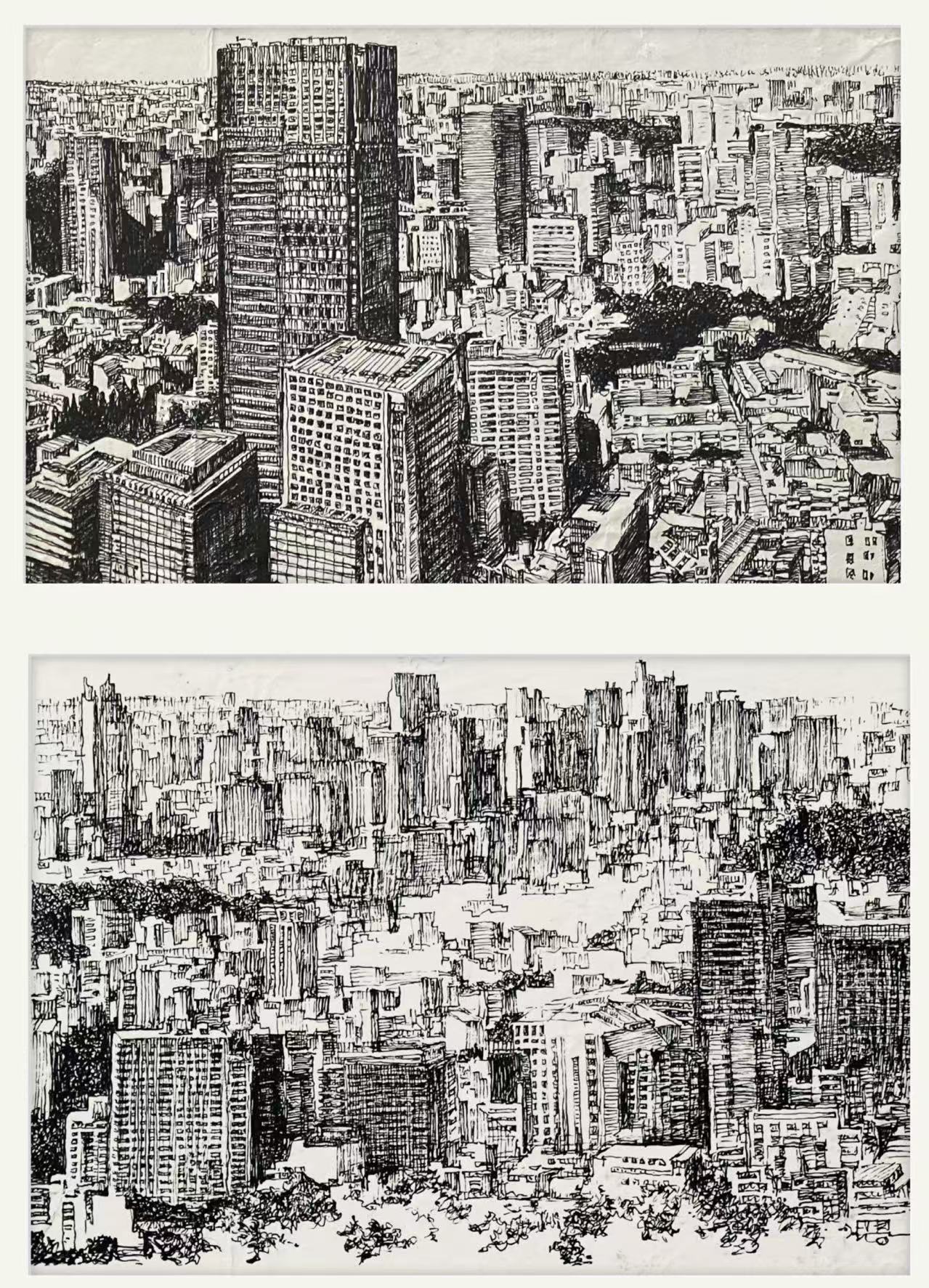 《新宿都厅鸟瞰》陆建新明信片迷你钢笔画