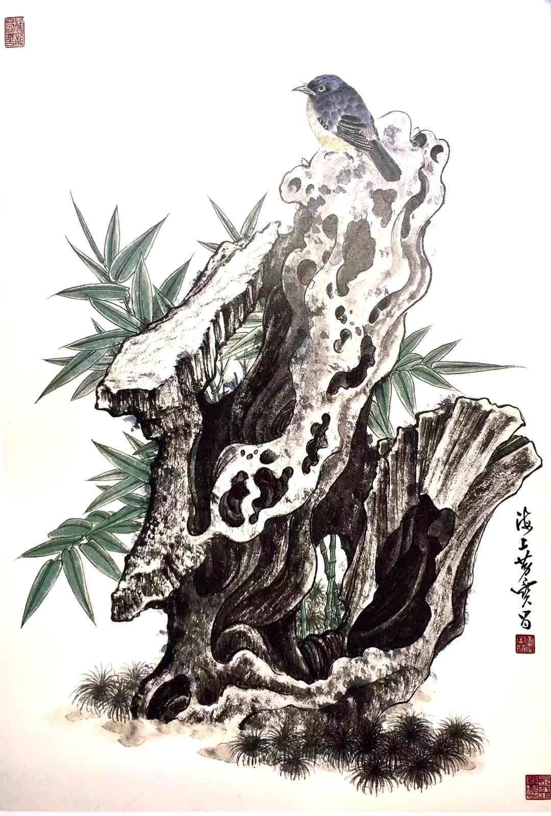 竹石小鸟·纸本工笔设色65x43cm