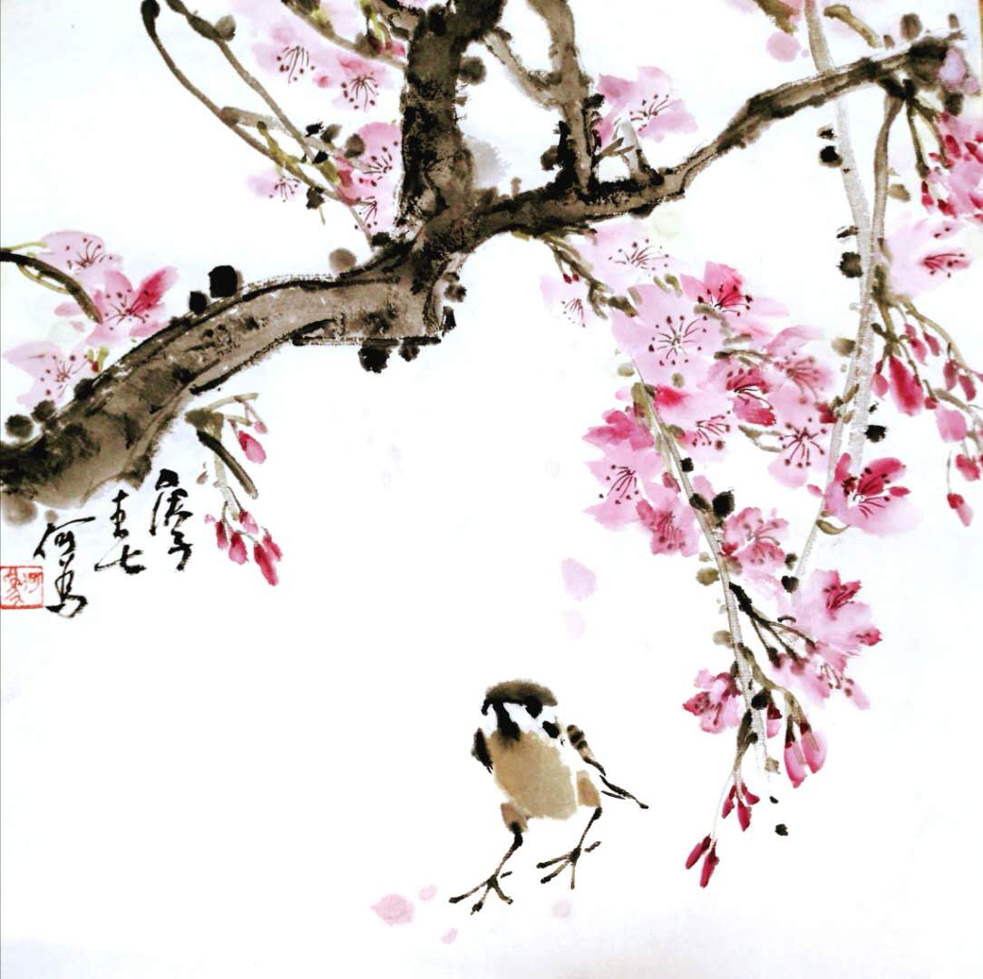 仲春风暖树,满目小桃花。雀儿应知早,来去叫喳喳。