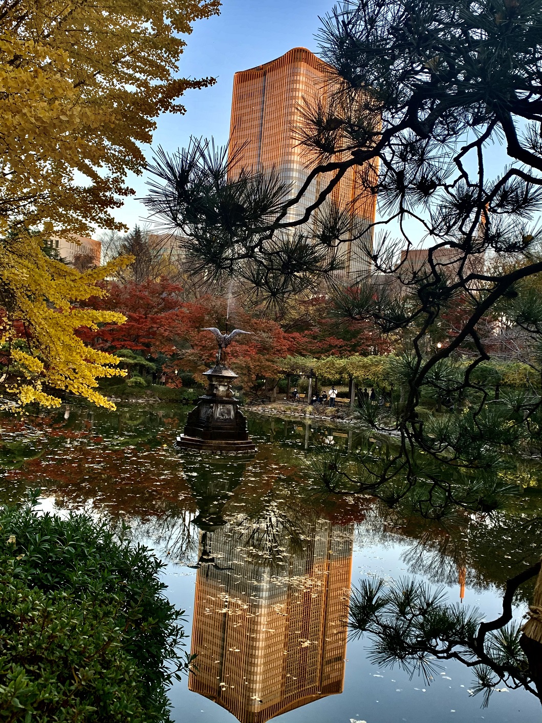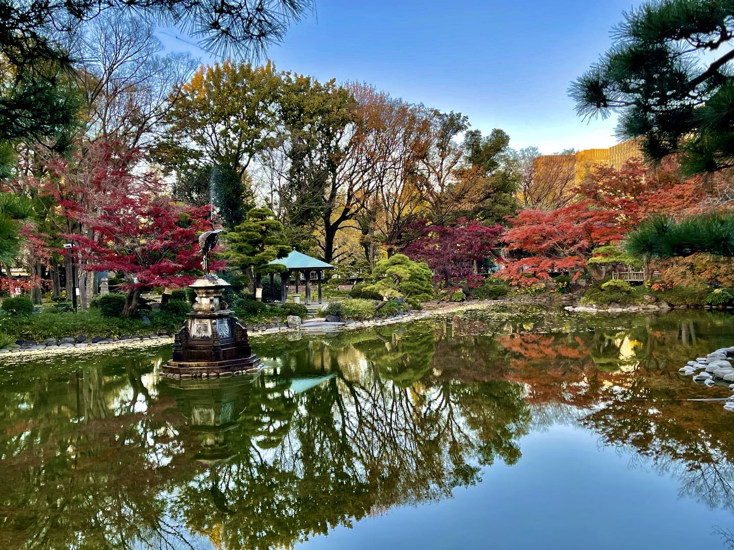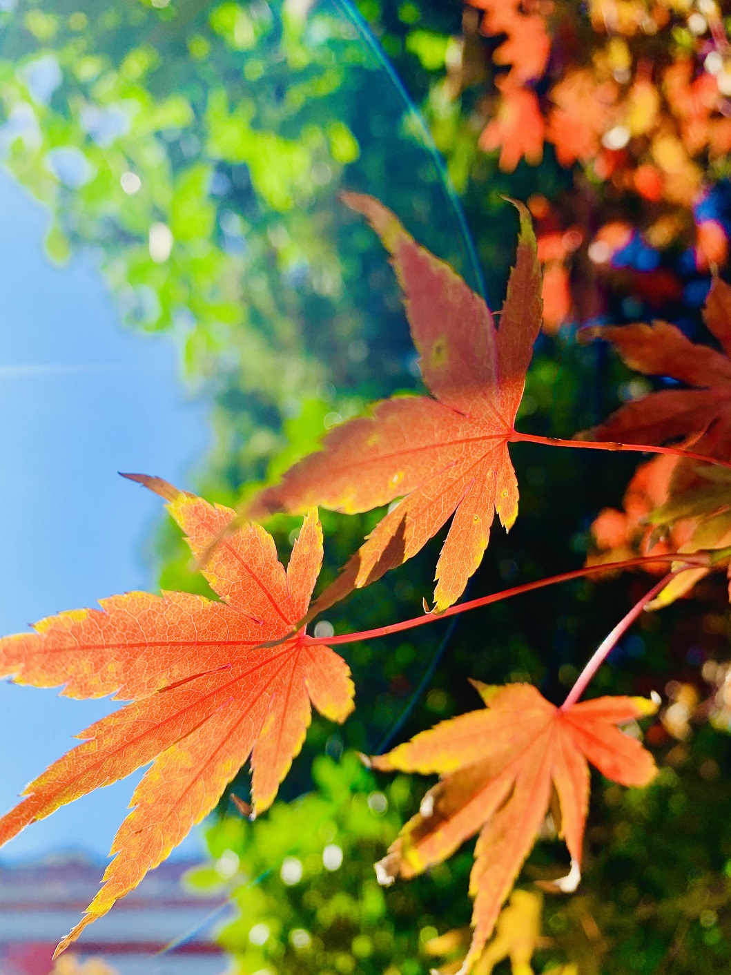 浓妆尽兴艳蓝天。 游东京近郊千叶县“养老溪谷”,白云缭绕,瀑水流潺,蓝天倒映,红叶逐波,其声如乐,娓娓动听,其景似画,美不胜收。