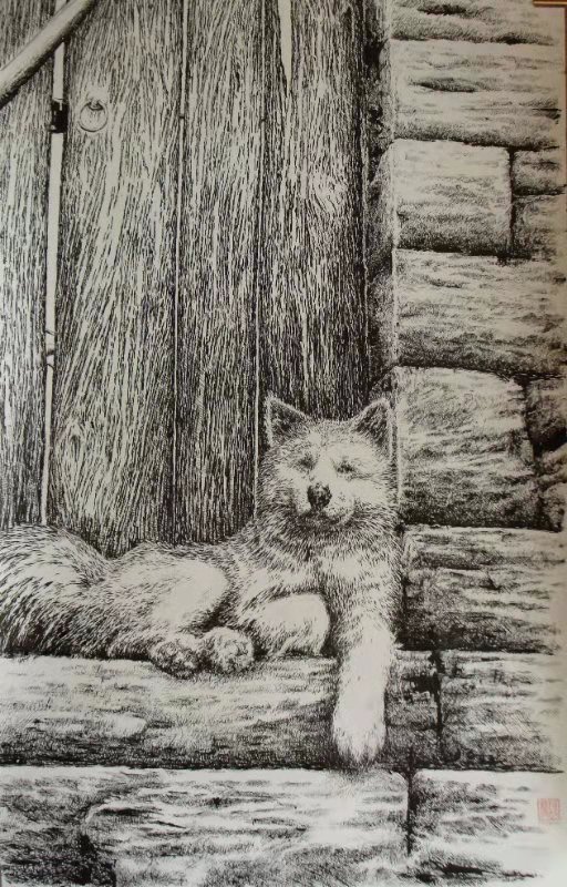 朴永哲以动物为主题材钢笔(黑白)画《狗与门》