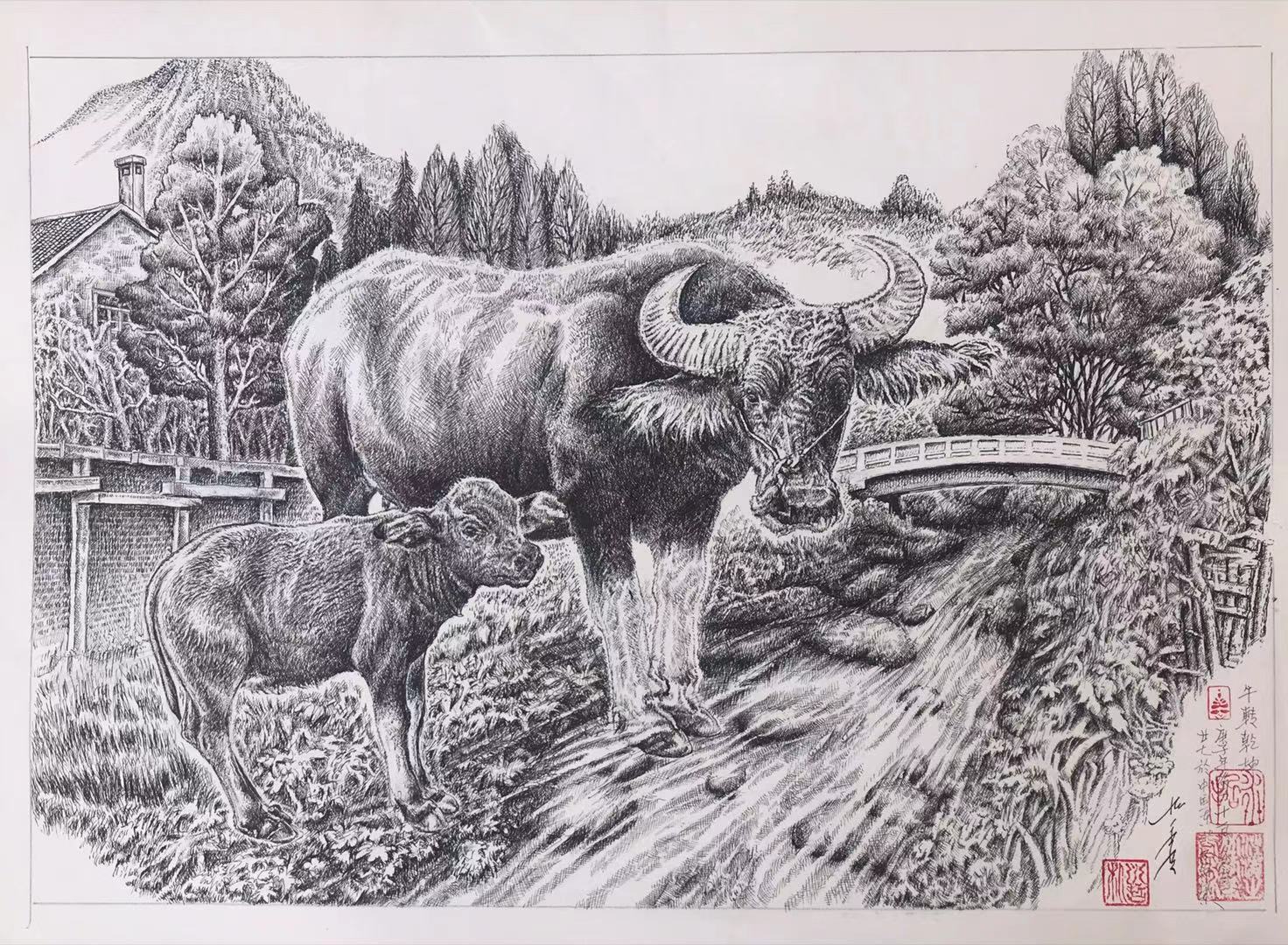 动物(母牛和小牛)题材钢笔(黑白)画真迹原创精品