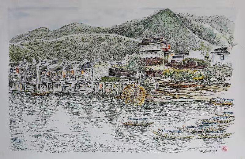 朴永哲钢笔淡彩画《湘江凤凰古城沱江之四》乙未羊年