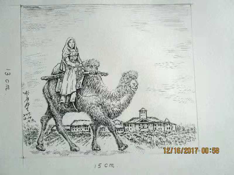 朴永哲钢笔画微型小品《西域美女骑骆驼》