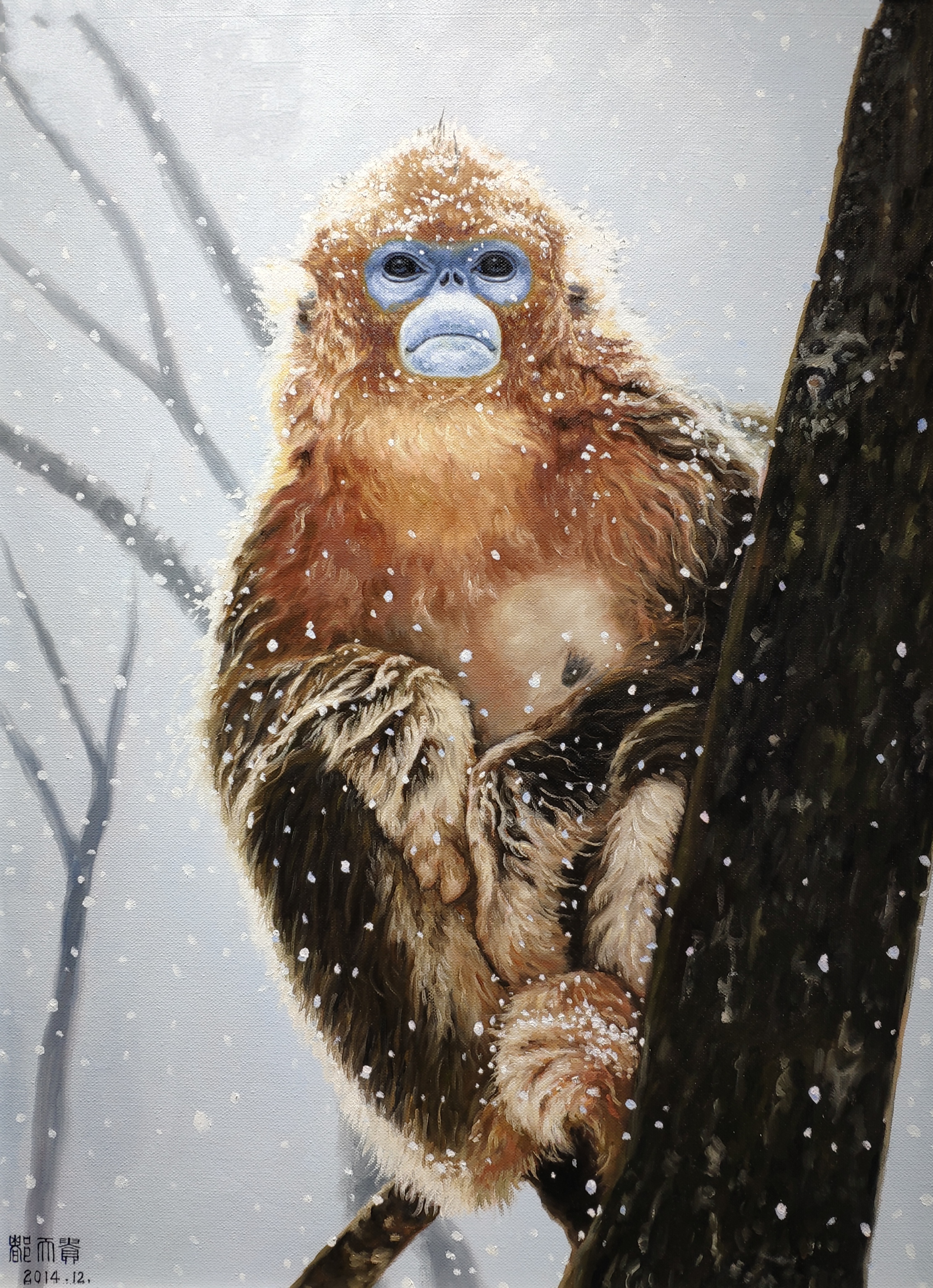 都天贵  油画:雪中的金丝猴(60厘米X80厘米)