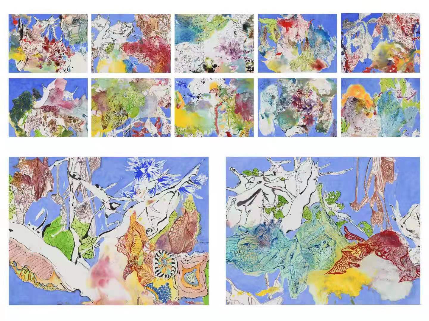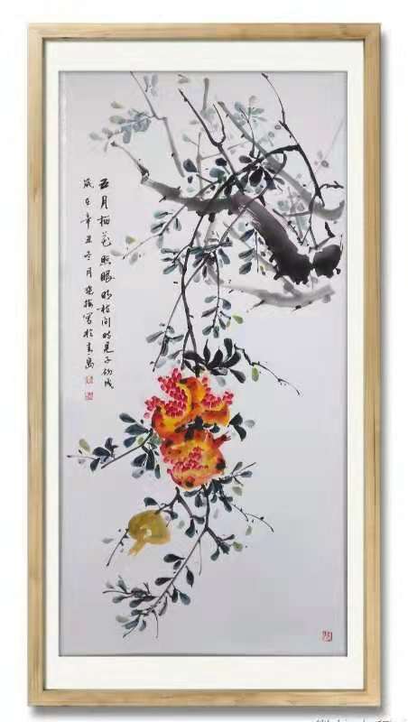 我的花鸟画创作主要源于生活,抒写着自己对美好的希冀。石榴、柿子、葡萄在国人眼里视为风水物。因“柿”与“事”谐音,人们便将诸多吉祥内涵融入其中。如四(五)世同堂、一世平安、事事如意等。又如葡萄、石榴籽叶繁茂,被人们寓为:多子多福、子叶(业)兴旺等诸多美好的向往!美好的寓意让人产生积极向上的蓬勃朝气。