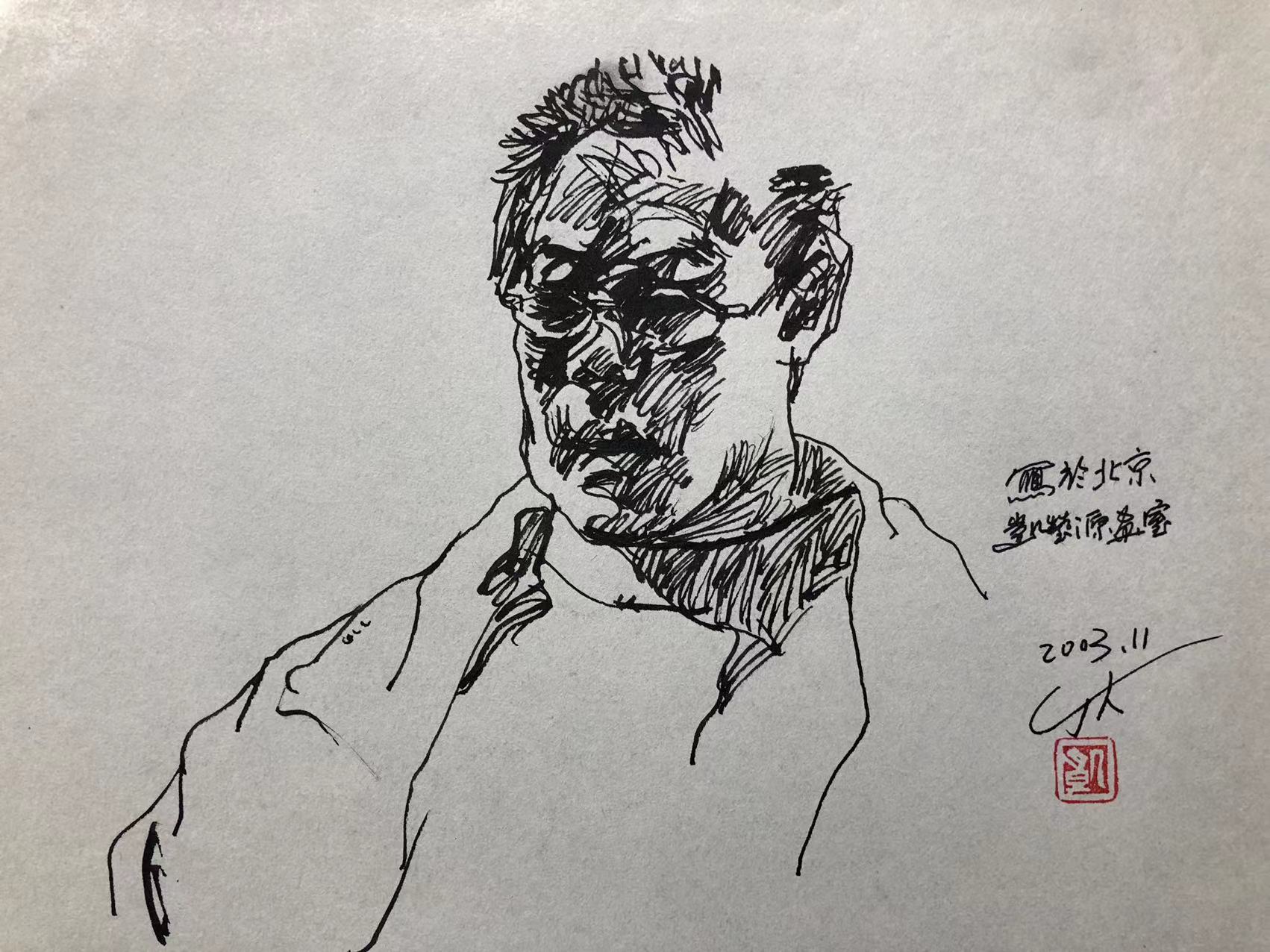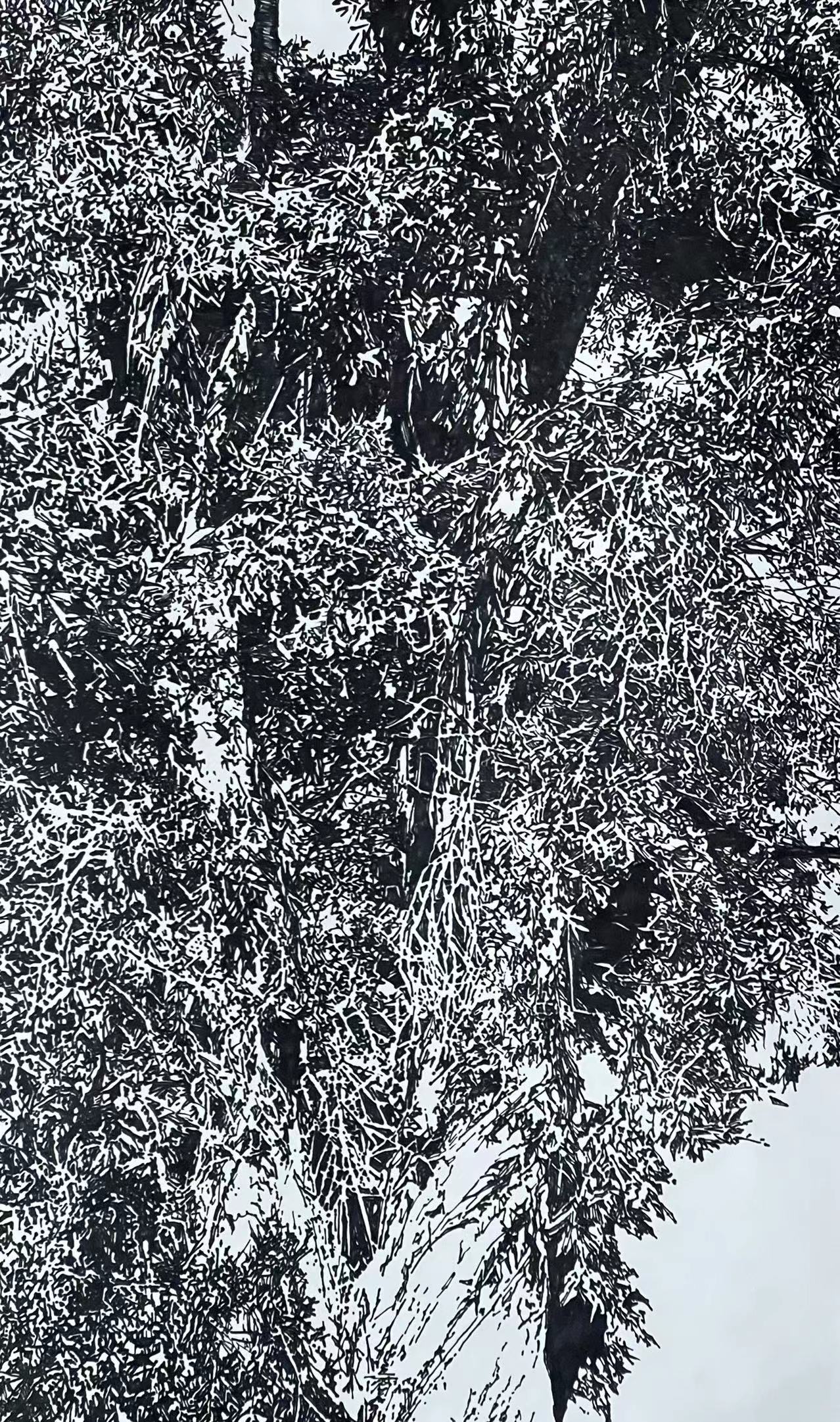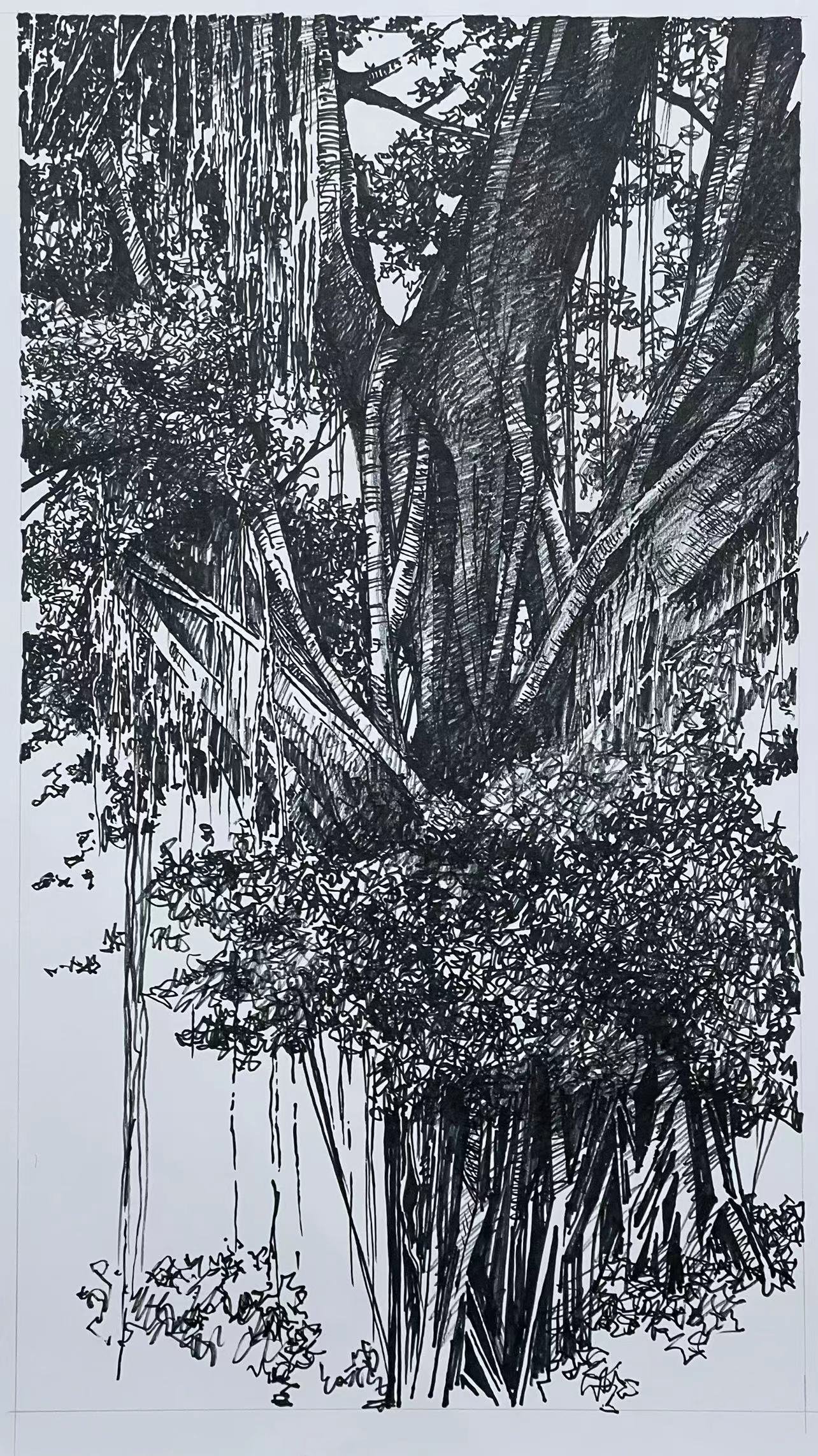 陆建新 油性签字笔画两幅《迎宾馆古榕》《流花公园千层