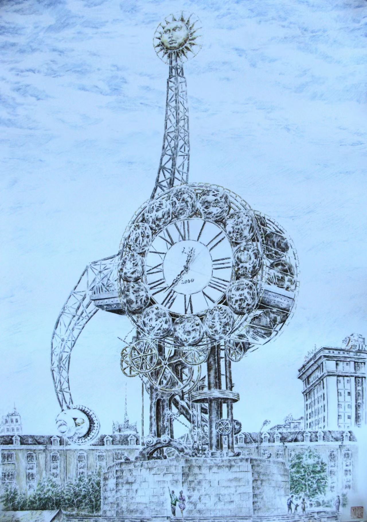 朴永哲钢笔画  天津世纪钟