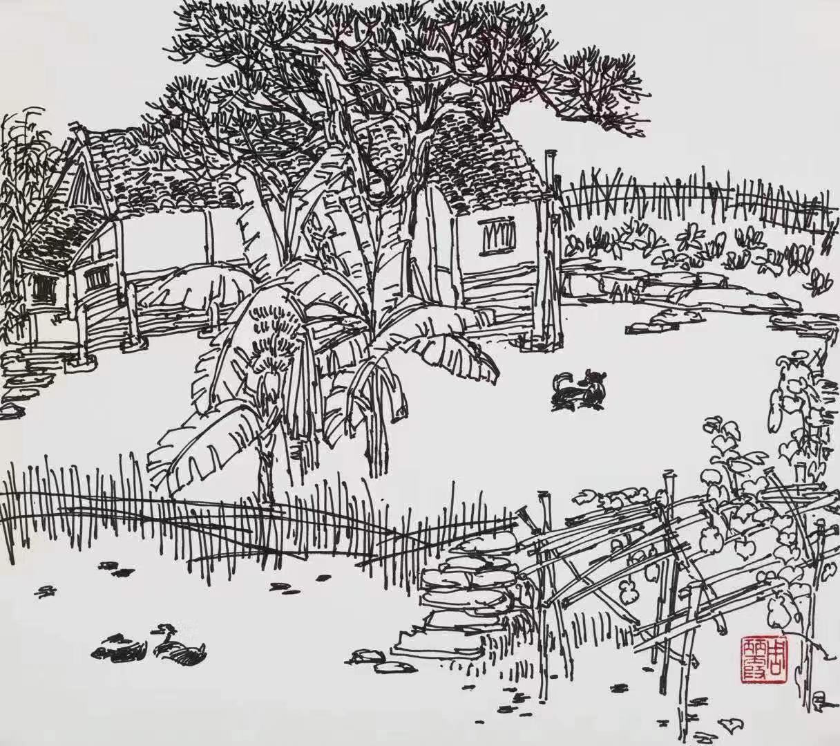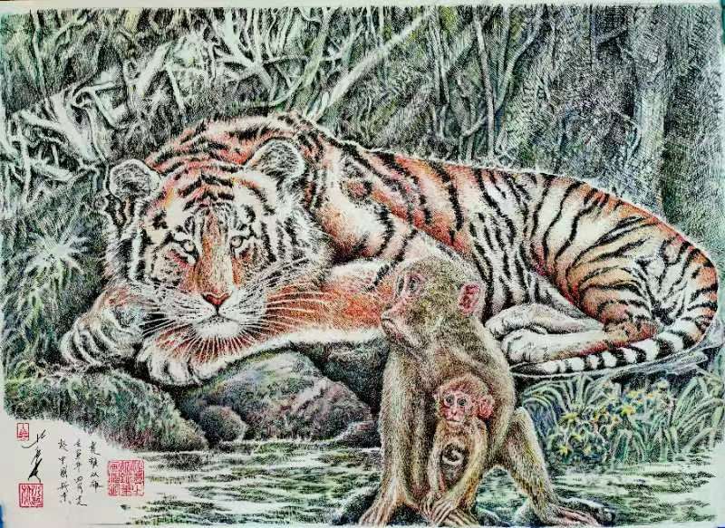 朴永哲钢笔(淡彩)画《虎猴双雄》