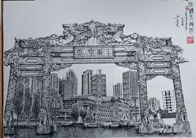 朴永哲钢笔(黑白)画《沈阳老北市》