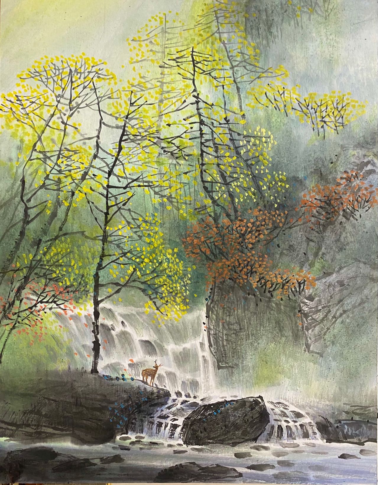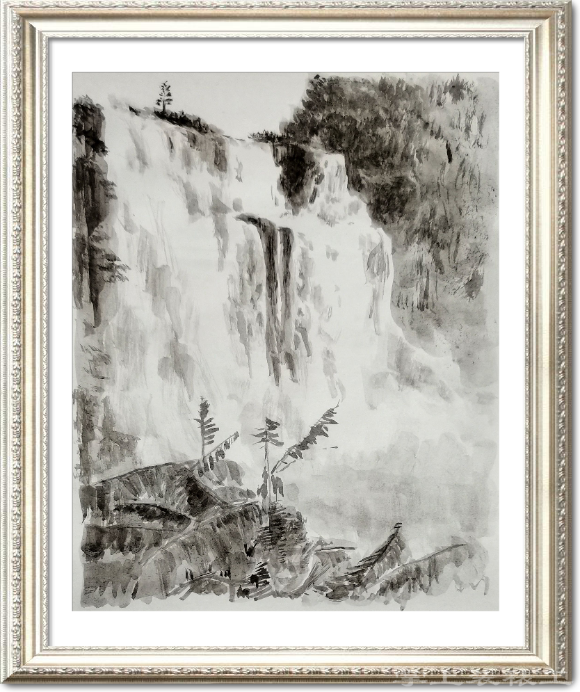 青山绿叶芭蕉,夏日瀑布潇潇,一缕彩虹作桥。