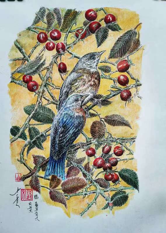 朴永哲钢笔淡彩画《鸫》