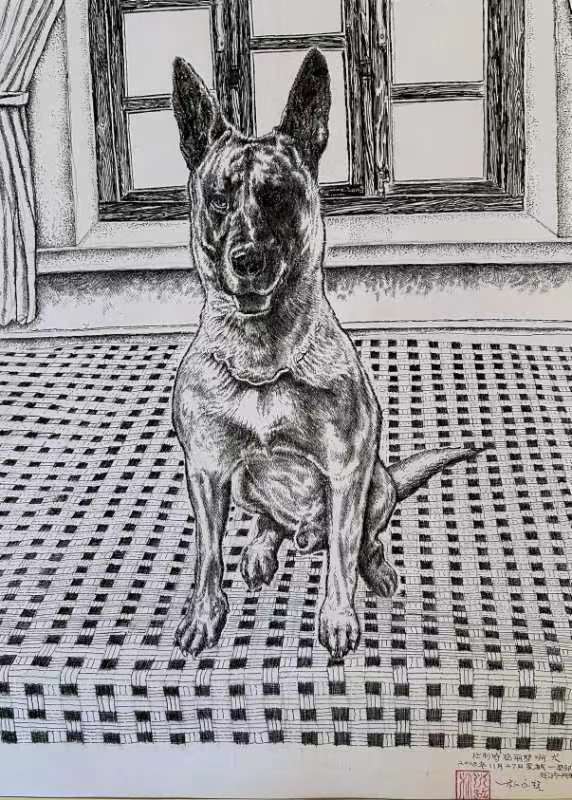 朴永哲钢笔画《比利时玛丽努啊犬》