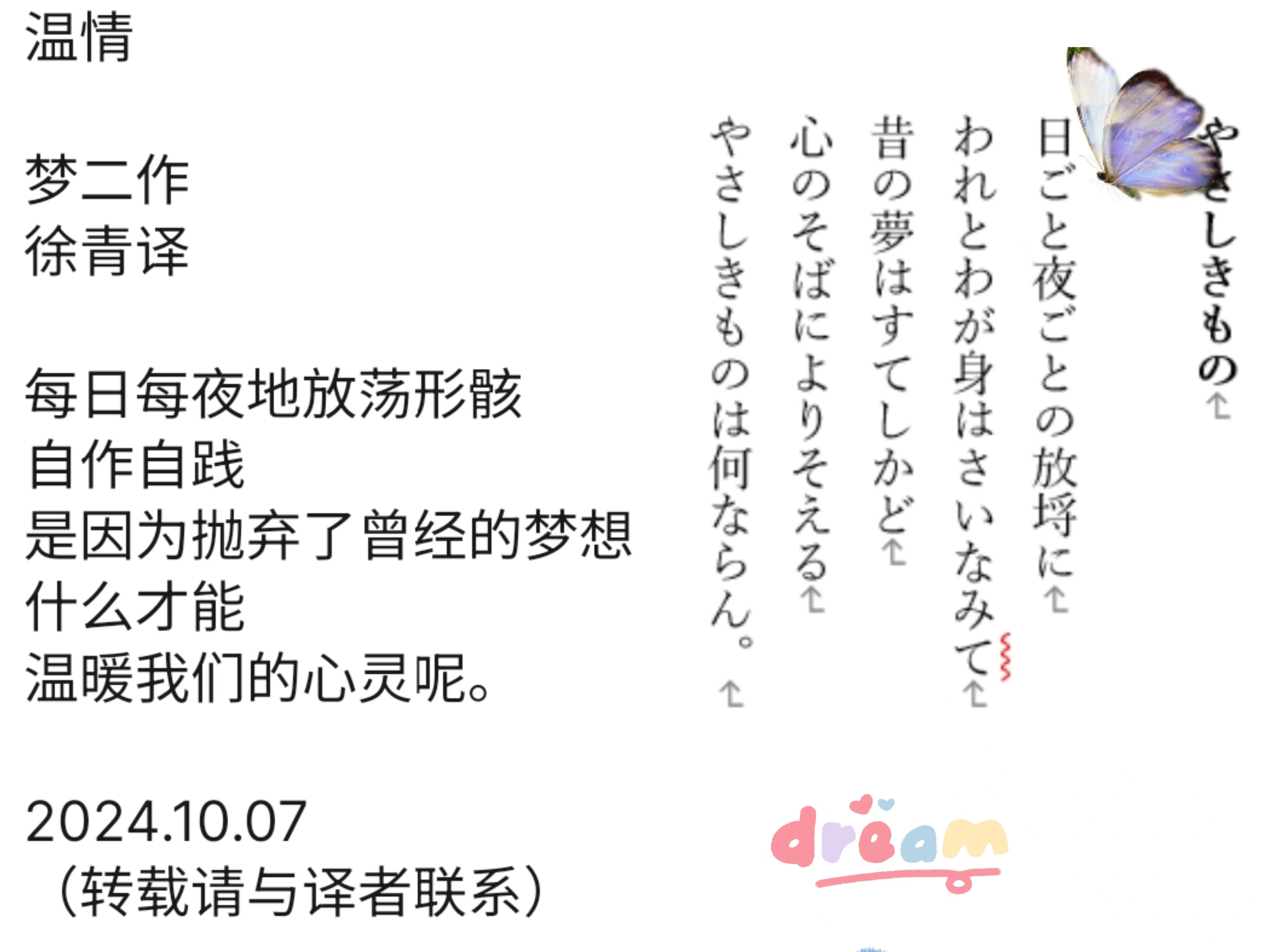 日语中有一个单词叫“想定外”,它的含义我想是不言而喻的。日本人常常把一些意想不到的事情,称之谓“想定外”。这一期的《东京亮点》上刊登了张力文女士的一篇文章,题目是“指尖如诗,拨动我沉睡的心弦”。文章写得感情充沛,如行云流水,值得一读,只是其中有一处提到我们的十四行诗,学生们完全可以看懂和理解,而且似乎是为中初级外国人的汉语学习量身打造的。这让我们感到“想定外”,也不敢当。东京有许多汉语教育的优秀人才,如果请教他们,无疑是一条行之有效的轻车熟路。听说现在学习汉语的日本人数已经接近100万人,然而遗憾的是,我在日本生活了三十余年,曾经也与不少自诩学习过汉语的日本人交往,但是能够流畅地说出汉语的人少之又少,而能够在大庭广众面前用汉语脱稿演讲的人更可谓是凤毛麟角。这是什么原因呢?我不得其解,我只是期望能在不远的将来能看到更多更好更实用的汉语教材,听到为数可嘉的日本人,能够配拉配拉地说着汉语,让人一个“想定外”.....
