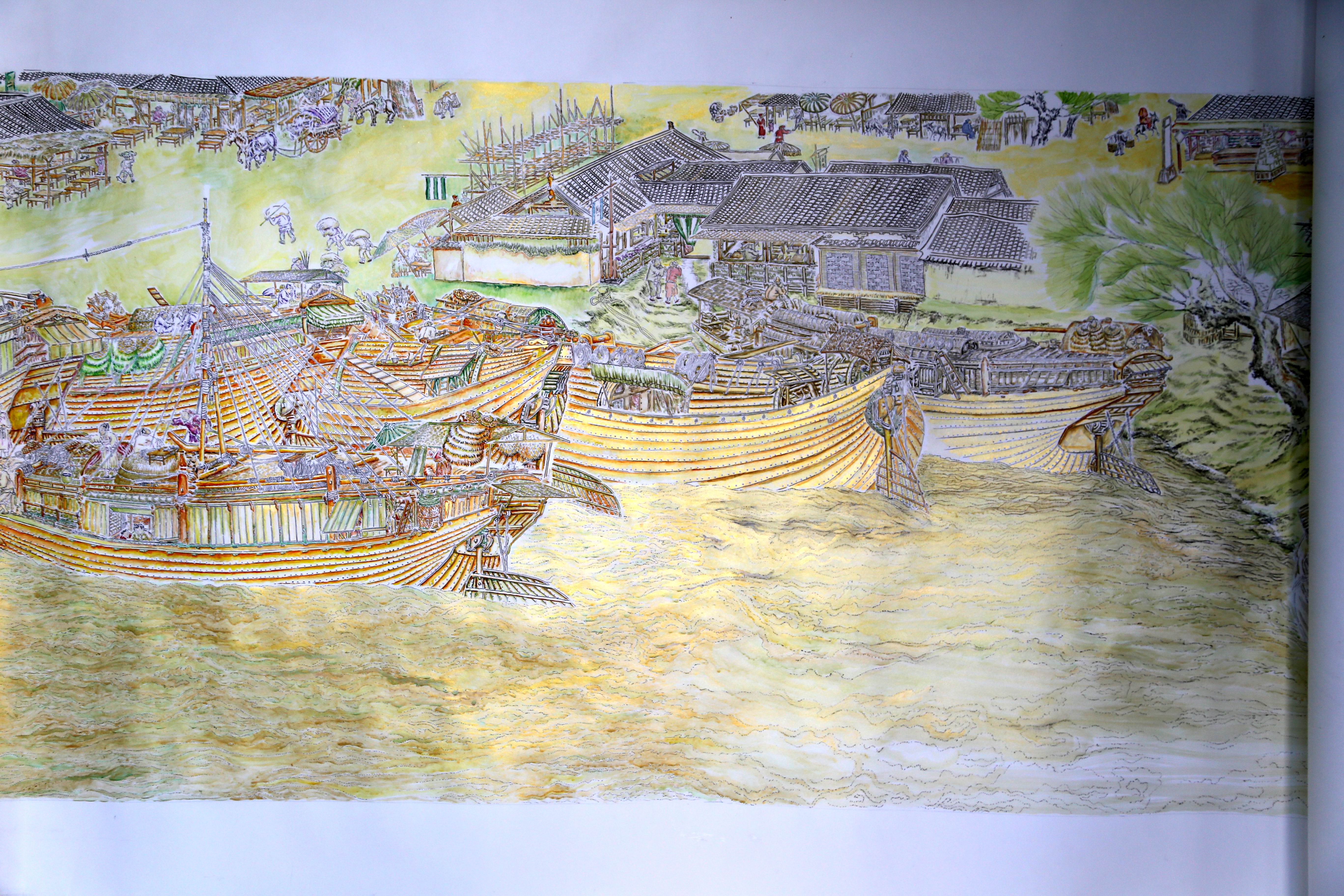 朴永哲钢笔(丙烯彩)画长卷《清明上河图》局部。