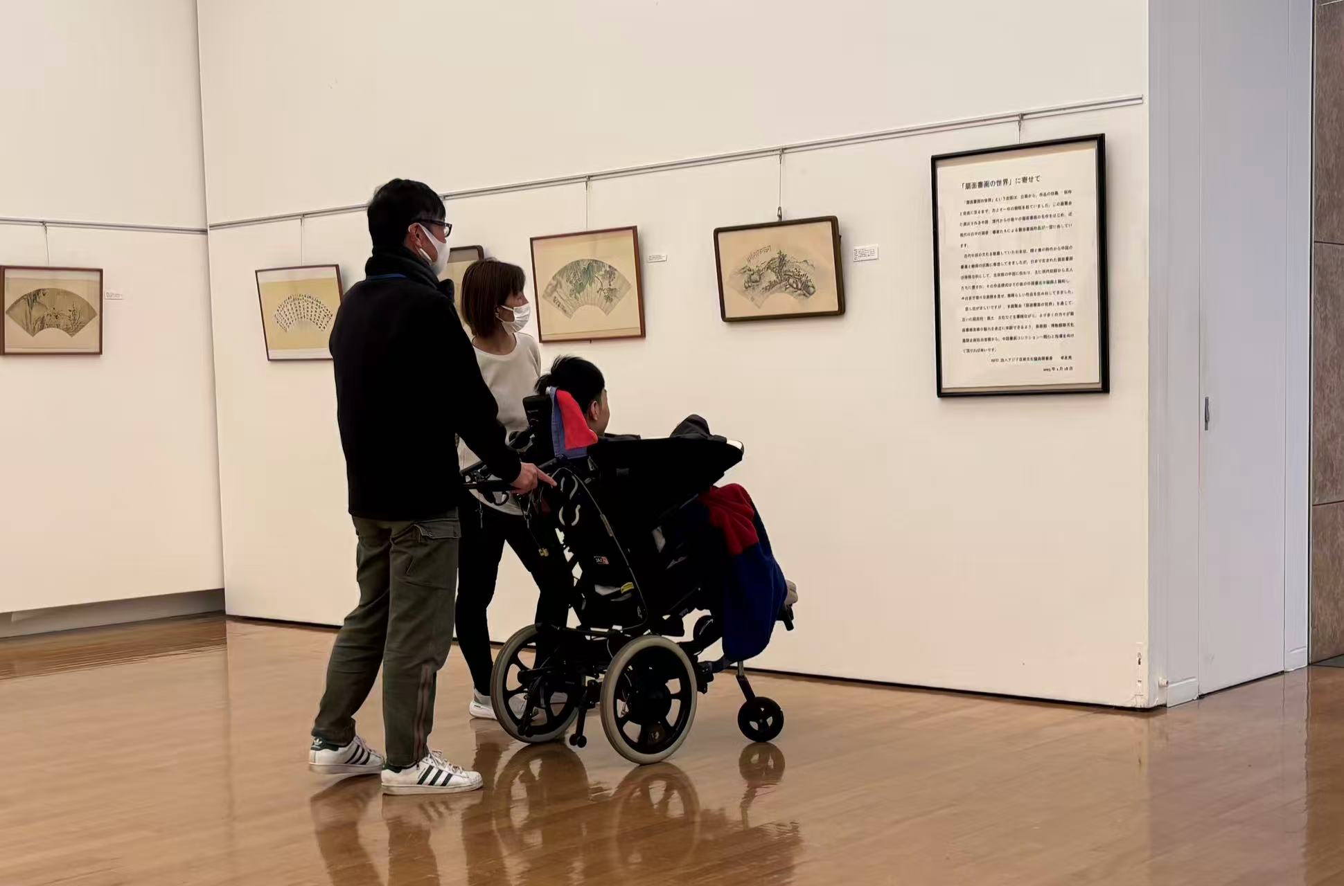 一对日本年轻的夫妇,带着他们的坐轮椅的儿子也来看画展了。从远处看,好像父亲正在对儿子解说着什么。这一动人的的情景,不禁让在场的中国画家们肃然起敬。
