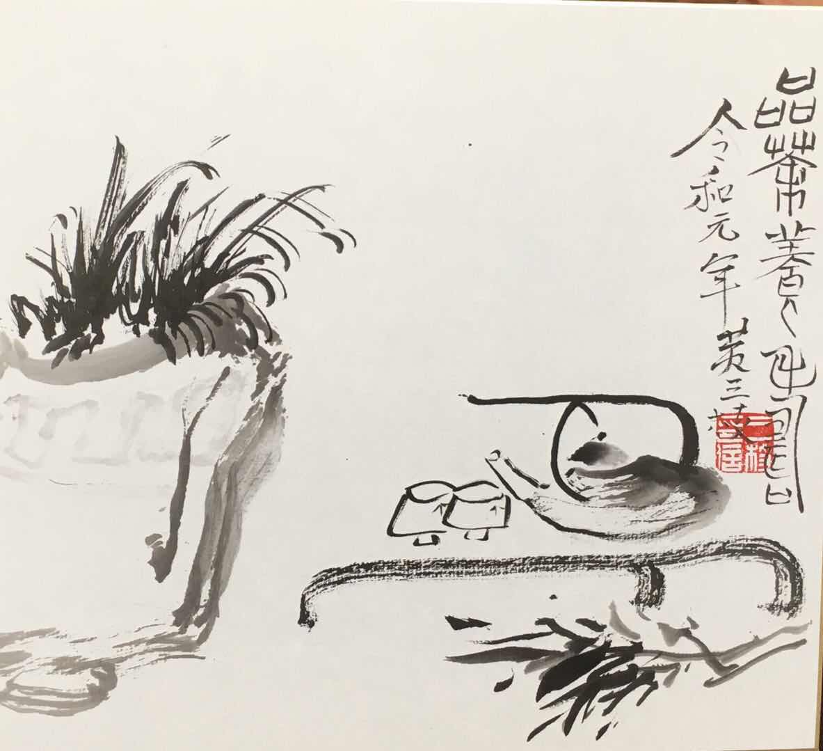 回到家中手机充电,拝读黃三枝先生画册,细细品味,选出几张自已喜欢的作品与大家分享。黃三枝先生的作品內函丰富,书法诗词的修练体現在作品之中,堪称中国画壇高手。今天观黃先生揮毫,用筆可谓鬼斧神工,一枝软毫毛筆,筆尖、筆肚、筆根都利用上了。毛筆散锋写出不同状态的线来,因勢利导,参差错落,韻味橫生,筆墨构成自己的特点。10幅小品只用了几滴墨,可谓惜墨如金。今天的聚会交流增加了对黃三枝先生的进一步的了解。