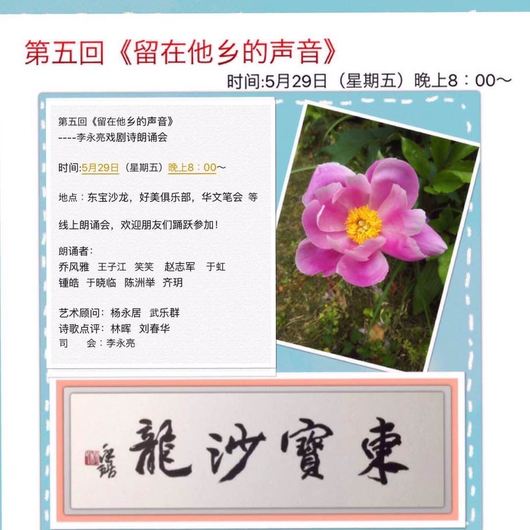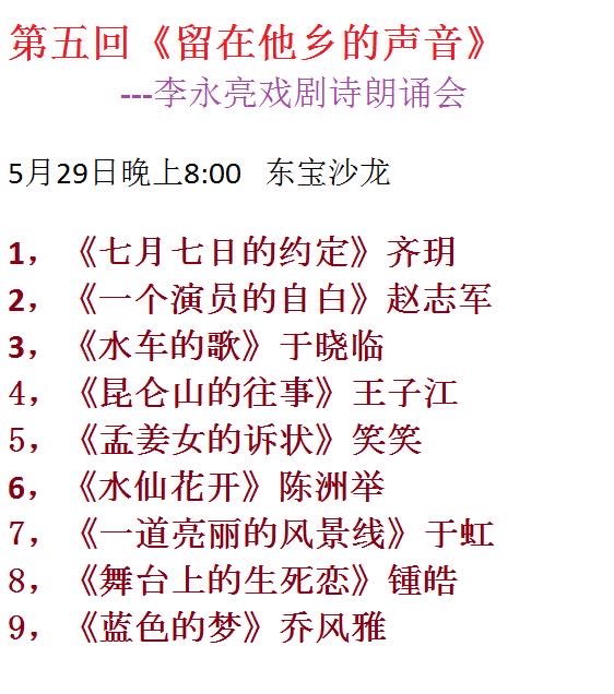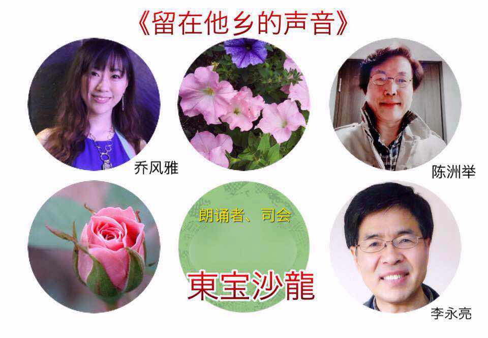 各位朋友,我们今天的第五回《留在他乡的声音》----李永亮戏剧诗朗诵会,到这里差不多可以打上完美的句号了。朗诵演员们的精彩语音艺术,给我们带来了至善至美的,纯洁而又崇高的享受,我们相信:《留在他鄉的声音》,这自由的声音一定会越过重洋,在华语圈内外生根开花和结果的。