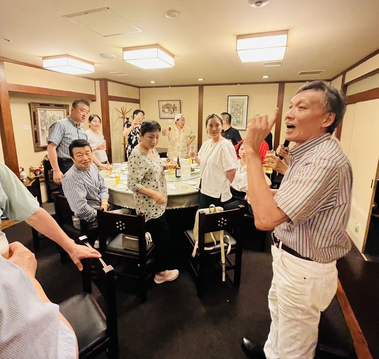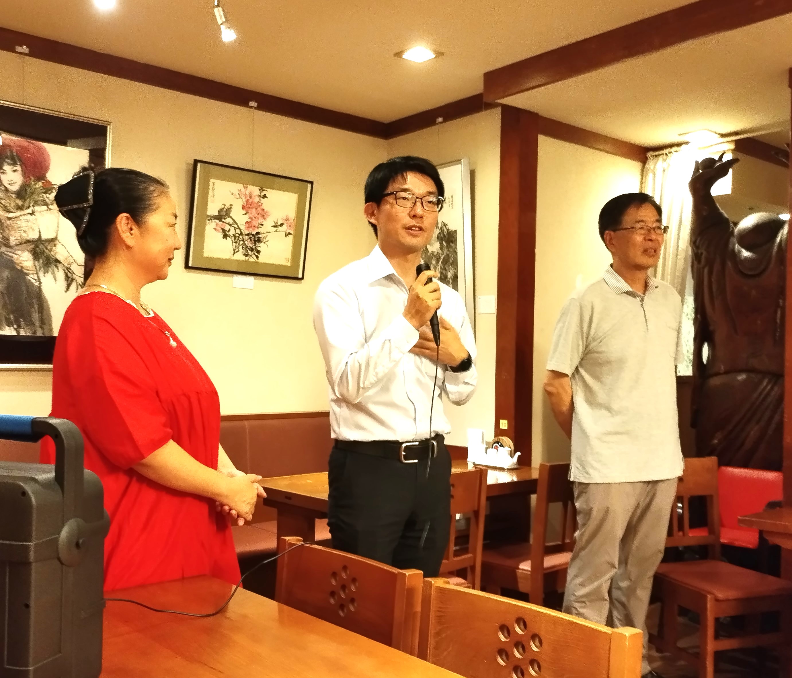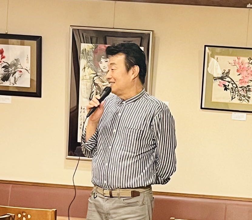 二位银座画廊的经营者也应邀来到会场,他们热情洋溢的讲话,使每位到场者都感受到了文化艺术带来的温馨和乐趣。随后举办的恳亲会更让大家共同分享美食与美术的魅力,祝愿日中友好,文化交流蒸蒸日上,万年常青。