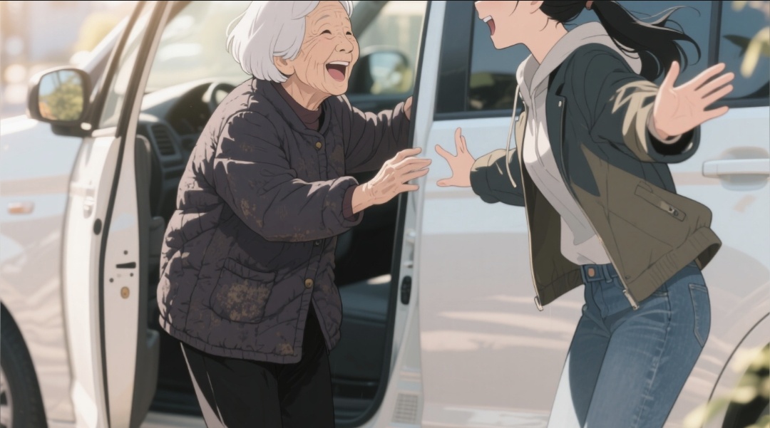 女士满脸宠溺,笑盈盈地赶紧接过老奶奶的行李,亲昵的说着些什么。突然二人同时望向车内我的方向,微笑、点头、招手、致谢,目送着车又启动。。。