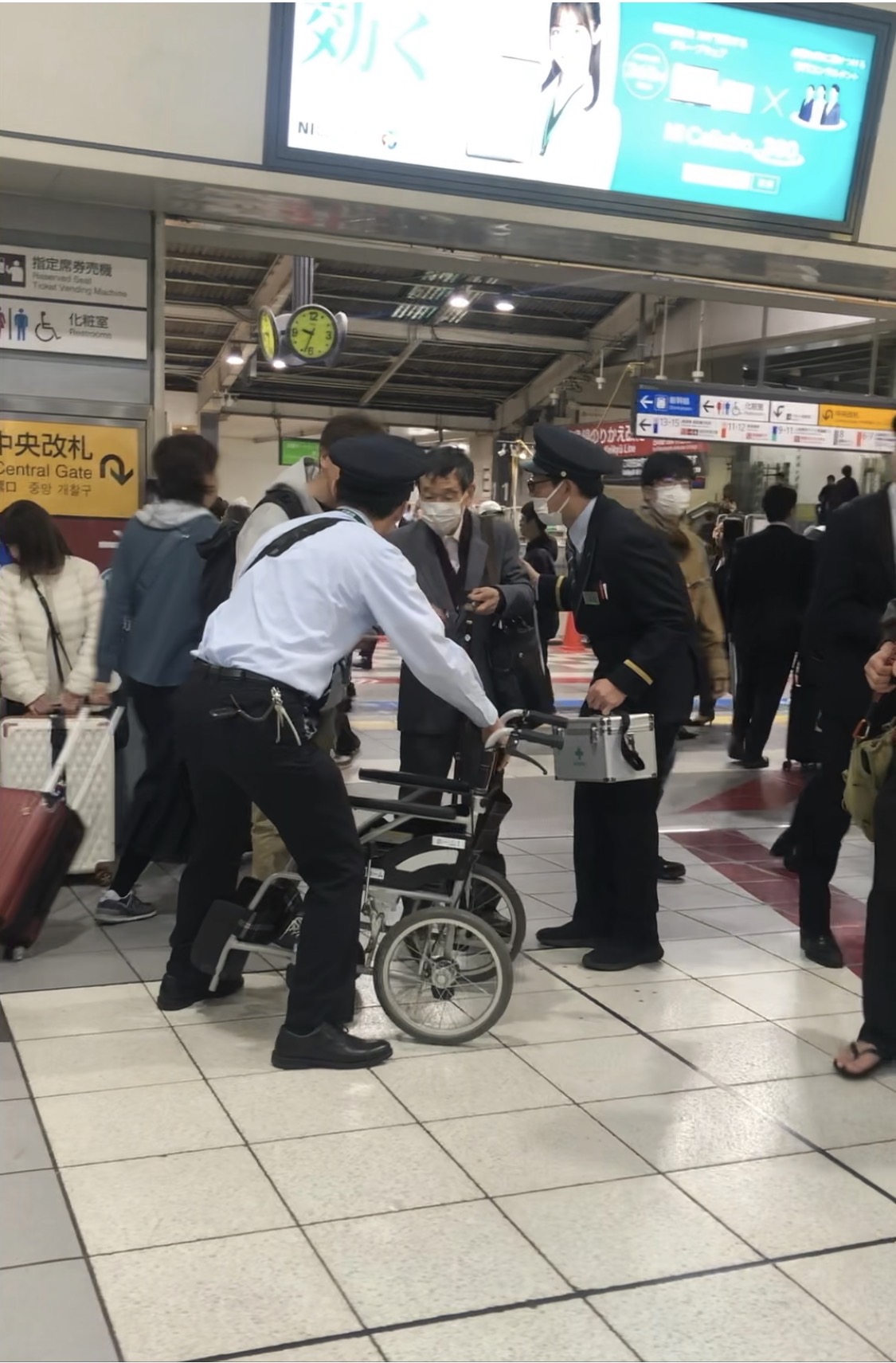 旁边有一位小伙子正在搀扶,还有一位拿着医药急救箱的车站工作人员,