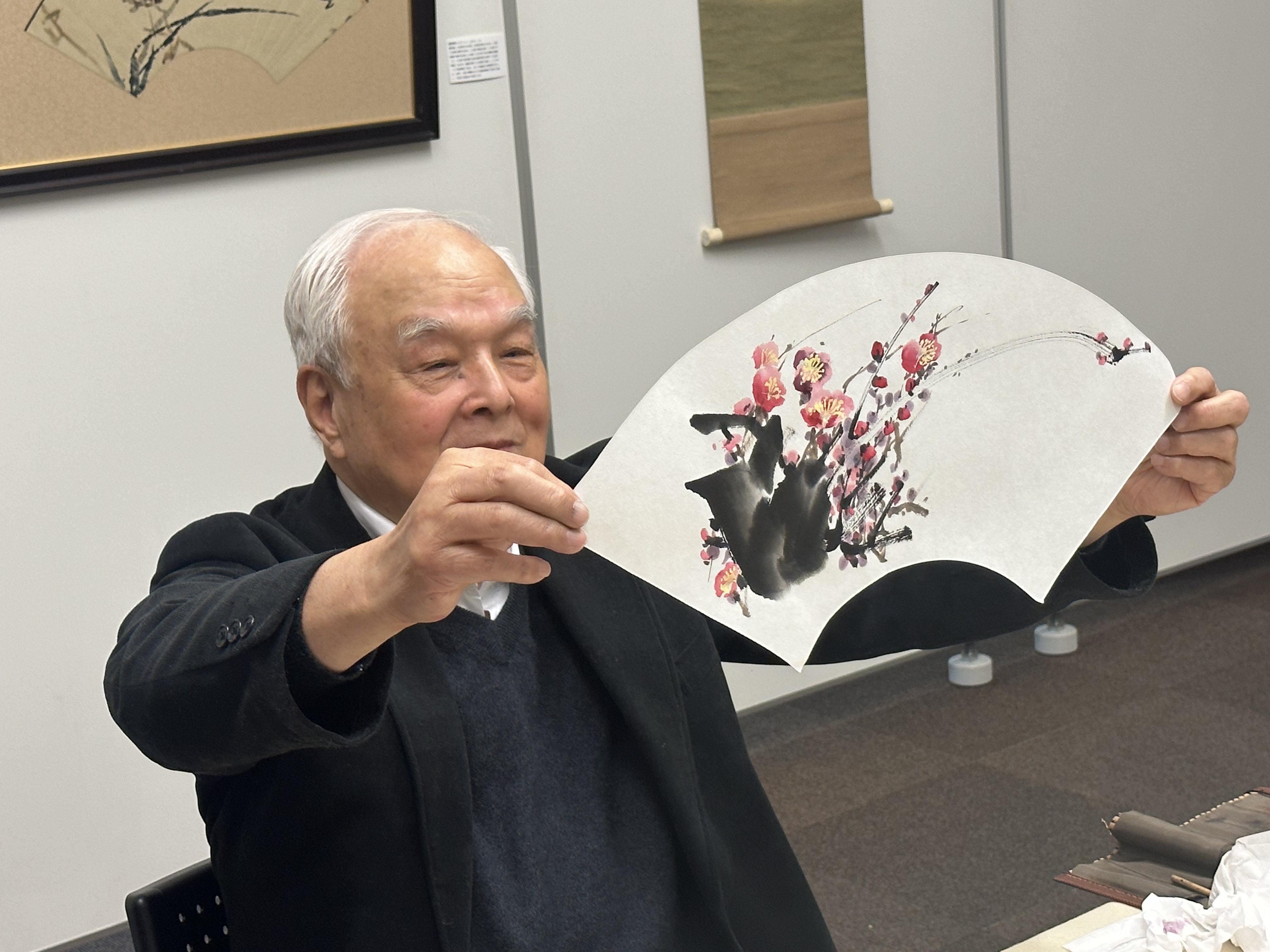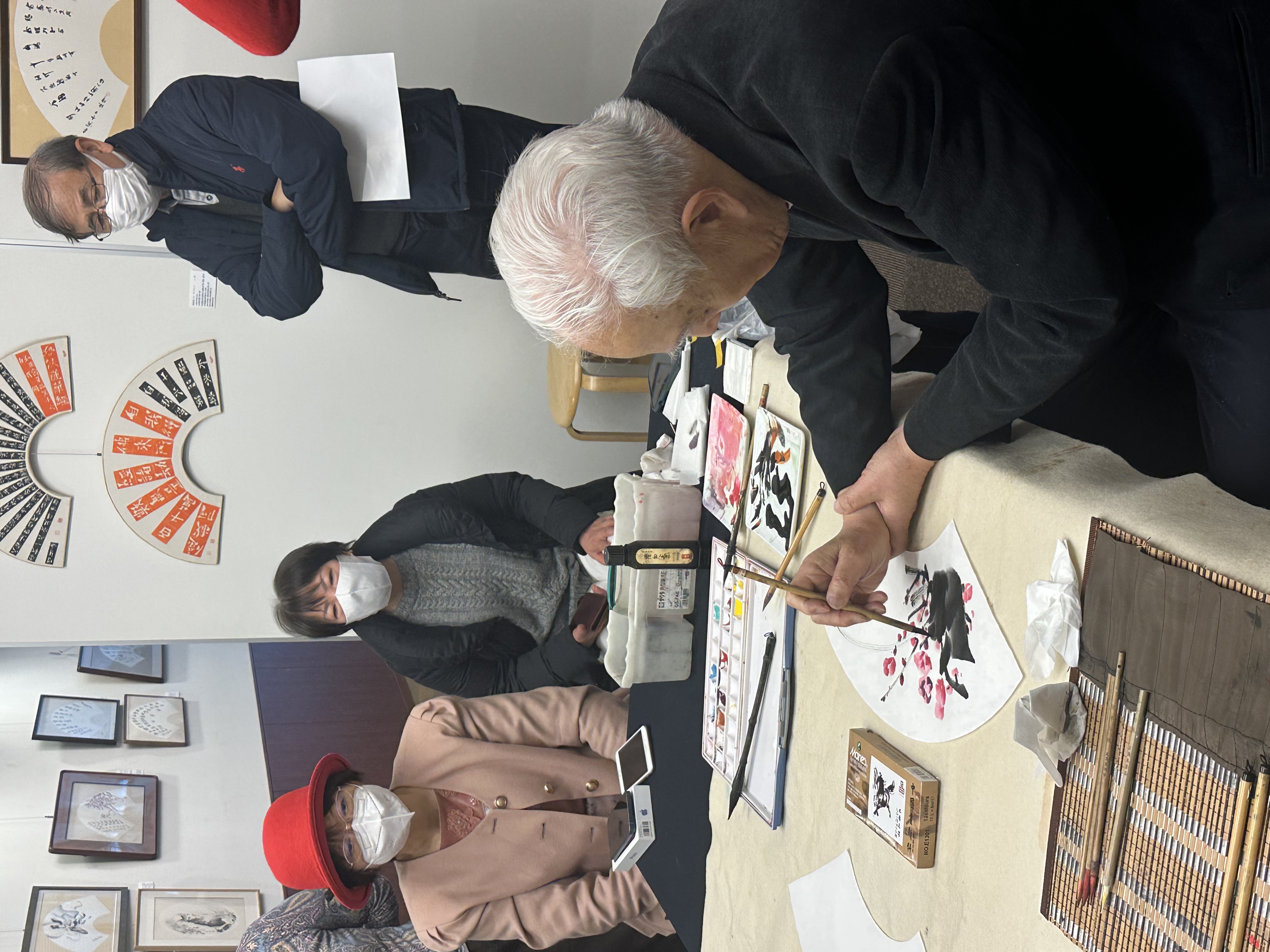 今天是东京入冬以来最为寒冷的一天,但在扇面书画的世界里,却充满了温馨的暖意。这是因为他来了,他是一位老者,更是一位贤者;他是一位艺术的高超者,更是一位正能量的传播者。扇面书画展的第四天,我们迎来了著名戏曲人物画家李文培先生。
