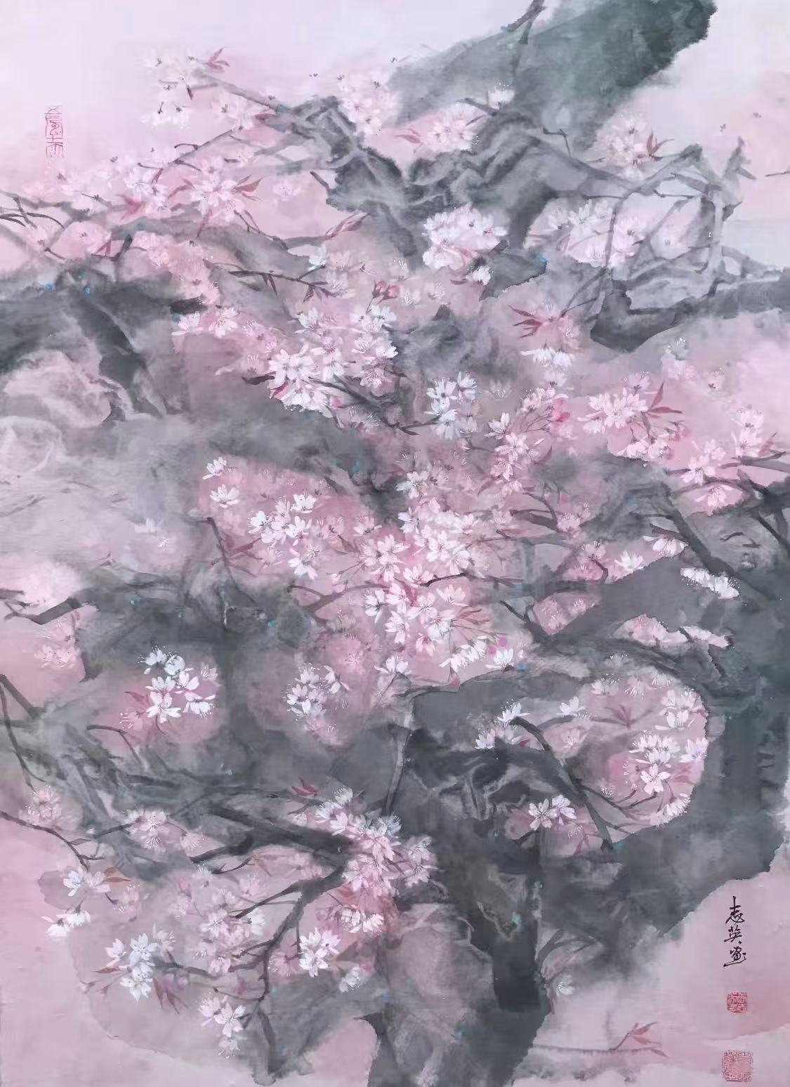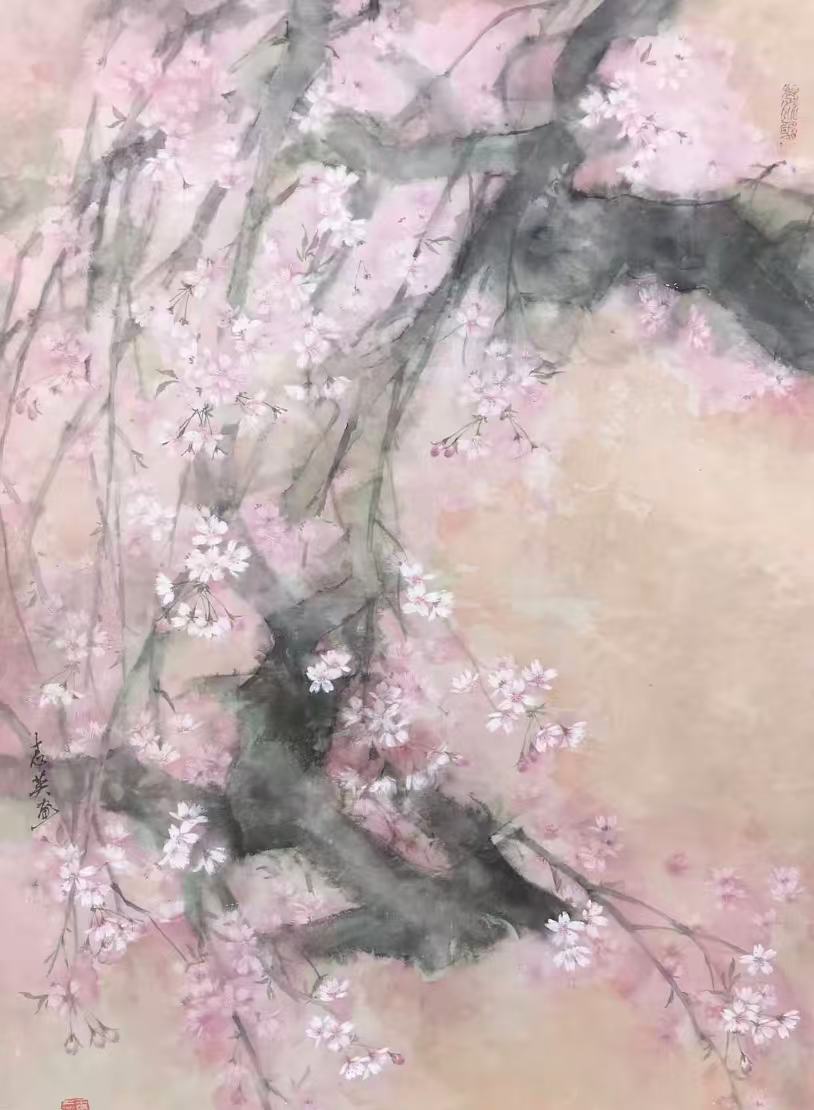 我也分析学习日本画中一些樱花名作,学习优秀画中的意境与色彩的融合。我深感从花苞到画一朵朵粉红色樱花渐变是一个美的历程,而画一棵樱花树更需把握氛围气场,从樱花花瓣飘逸里找出空间、距离感,试图来画出各种美的差异。坦率地说不厌倦画樱花是因为自己巳把人生和樱花重叠了,随着年复一年看到的东西又变了,有生之年想既平静又有趣地面对樱花,随着时间的推移来不断找寻樱花创作的新表现。