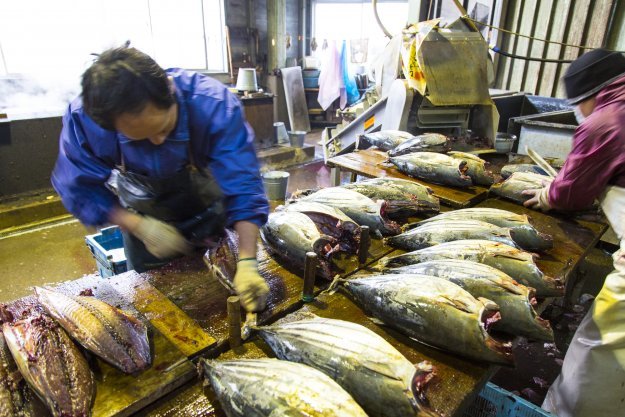 在枕崎水産加工業協同組合小湊芳洋参事的帮助下,我把从冷冻船上的卸货,市场的竞卖,到加工企业工人手工分拣,蒸煮,熏制,窖藏,晒干,刨花等详尽而有序的全过程都给拍了下来。印象最为深刻的,莫过于看掰开后的“本枯节”。鱼身呈琥珀色,像宝石一样熠熠发光。