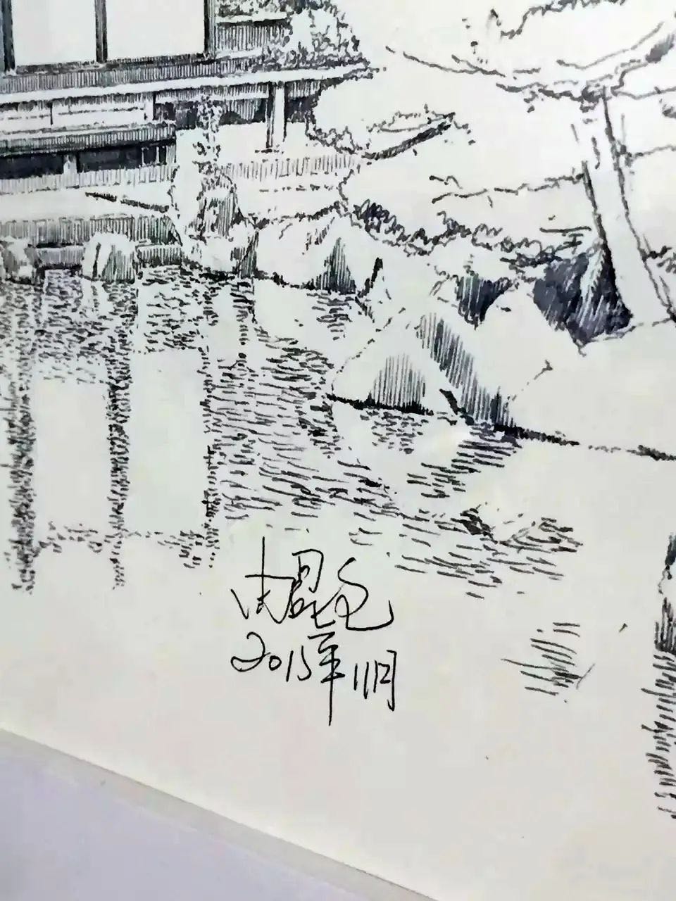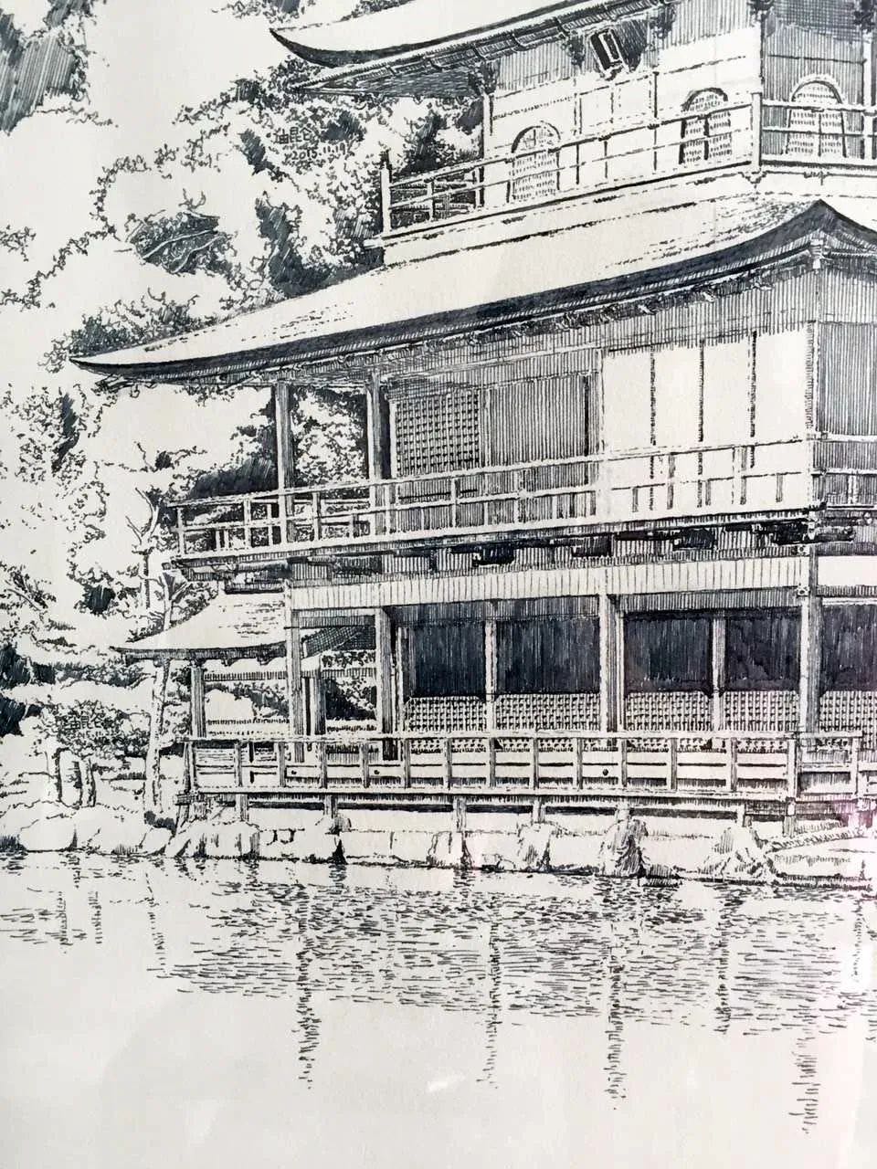 几年来,在我的书桌上方,一直挂着三田先生的钢笔画《金阁寺》。坐在桌前,抬眼即见。画面上,整座金阁寺巍峨耸立,倒影在水中舒朗铺展。再观细部,木栅细密规整,绕寺的树木繁简有致,乃至寺顶象征吉祥的凤凰亦傲然挺立......无处不传神而鲜明,其笔法细腻中见大气,稳健中现生动,运笔成熟自信,处处体现出三田先生的绘画功力。这座金阁寺,因是钢笔画,略去了色彩,更使这座建筑平添几分岑寂之美。