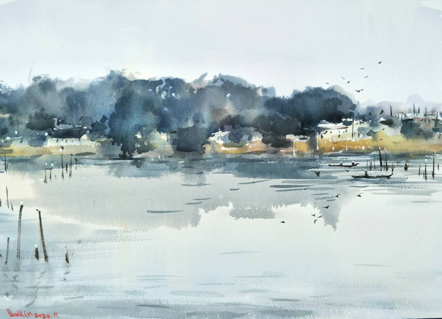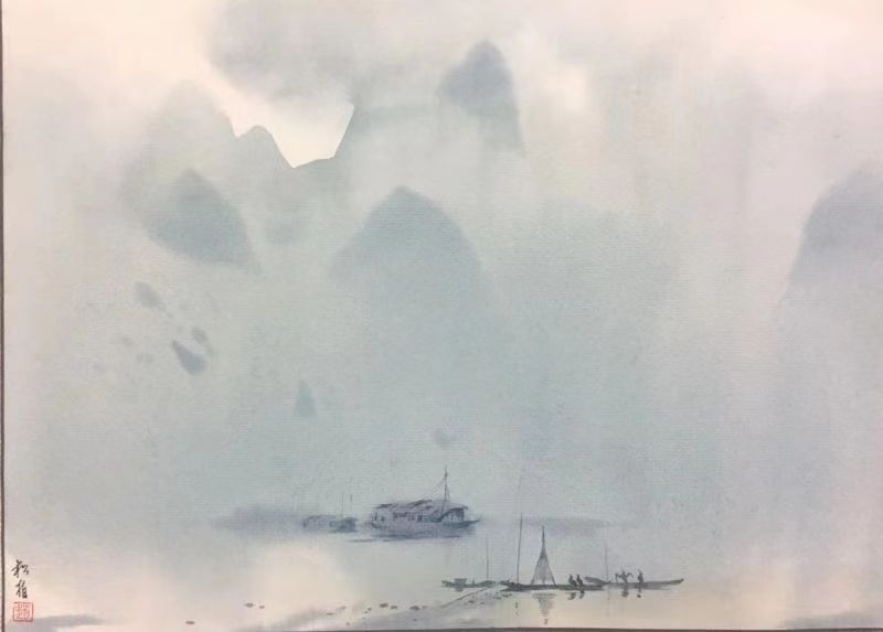 05、 赵松柏 漓江烟雨,38x53cm 镜片 水彩