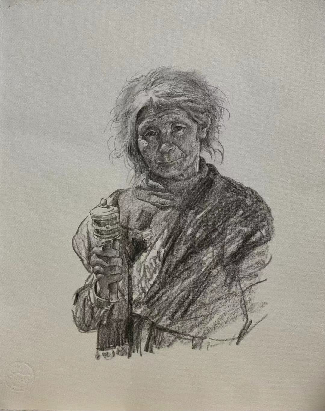 26 东强 石版画 西藏老妈妈 43x34cm 镜片