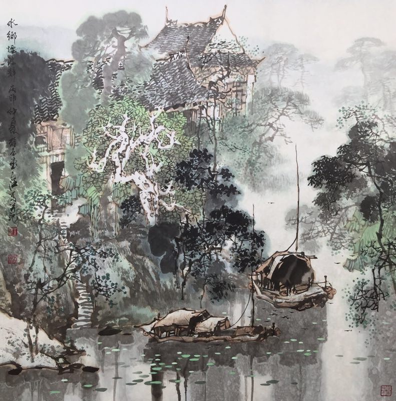 51 王子江 水乡烟波 79x79cm 水墨 镜框