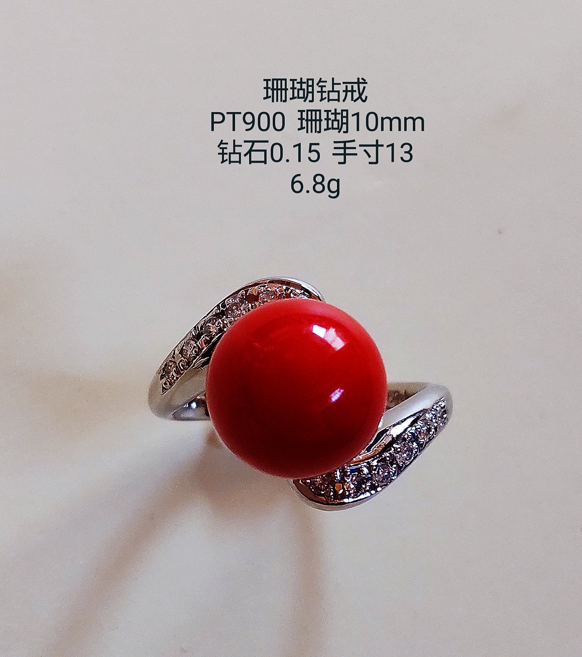 32,珊瑚钻戒    PT900    珊瑚10mm    钻石0.15    手寸13    6.8g