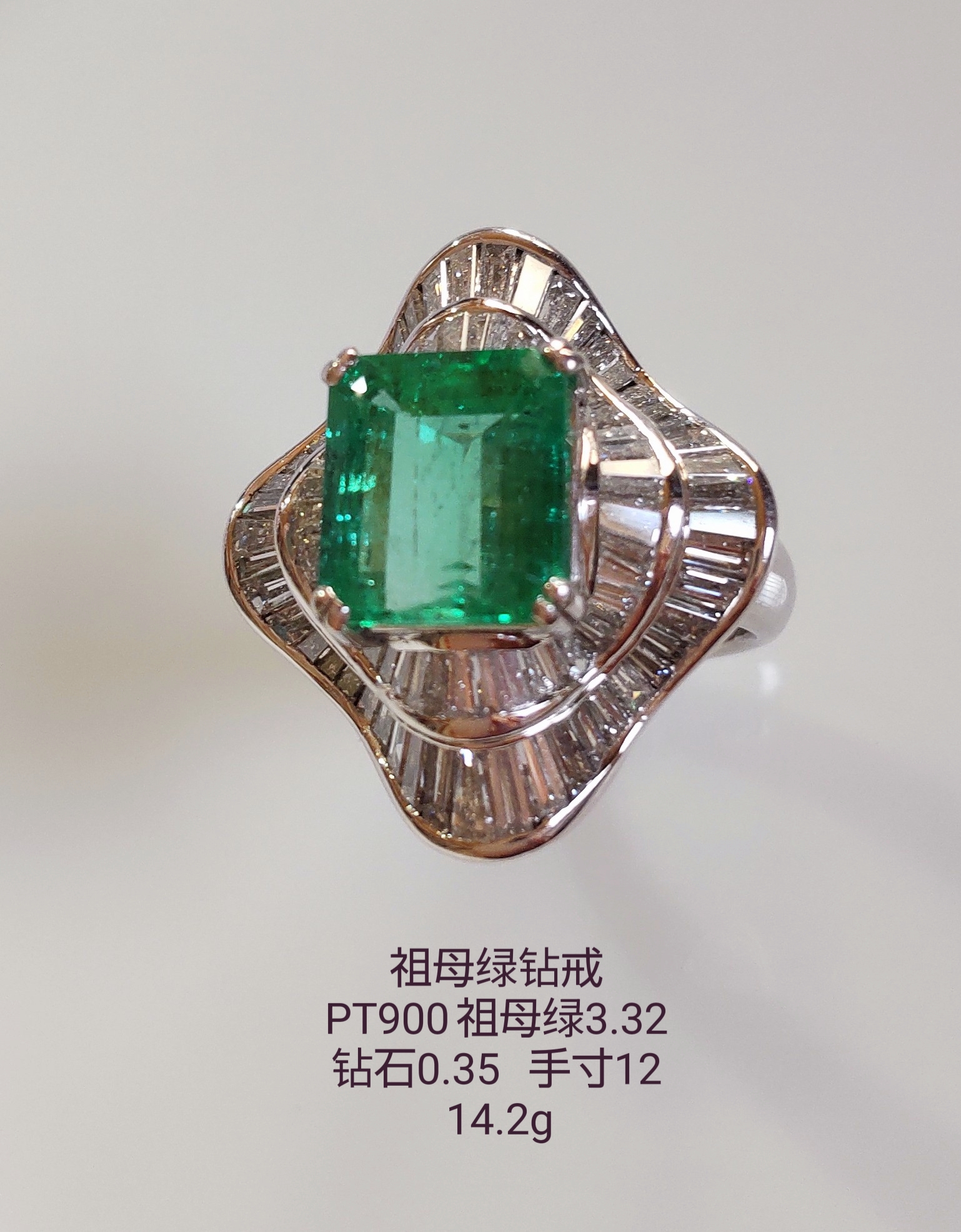 35,祖母绿钻戒    PT900    祖母绿3.32    钻石0.35    手寸12    14.2g