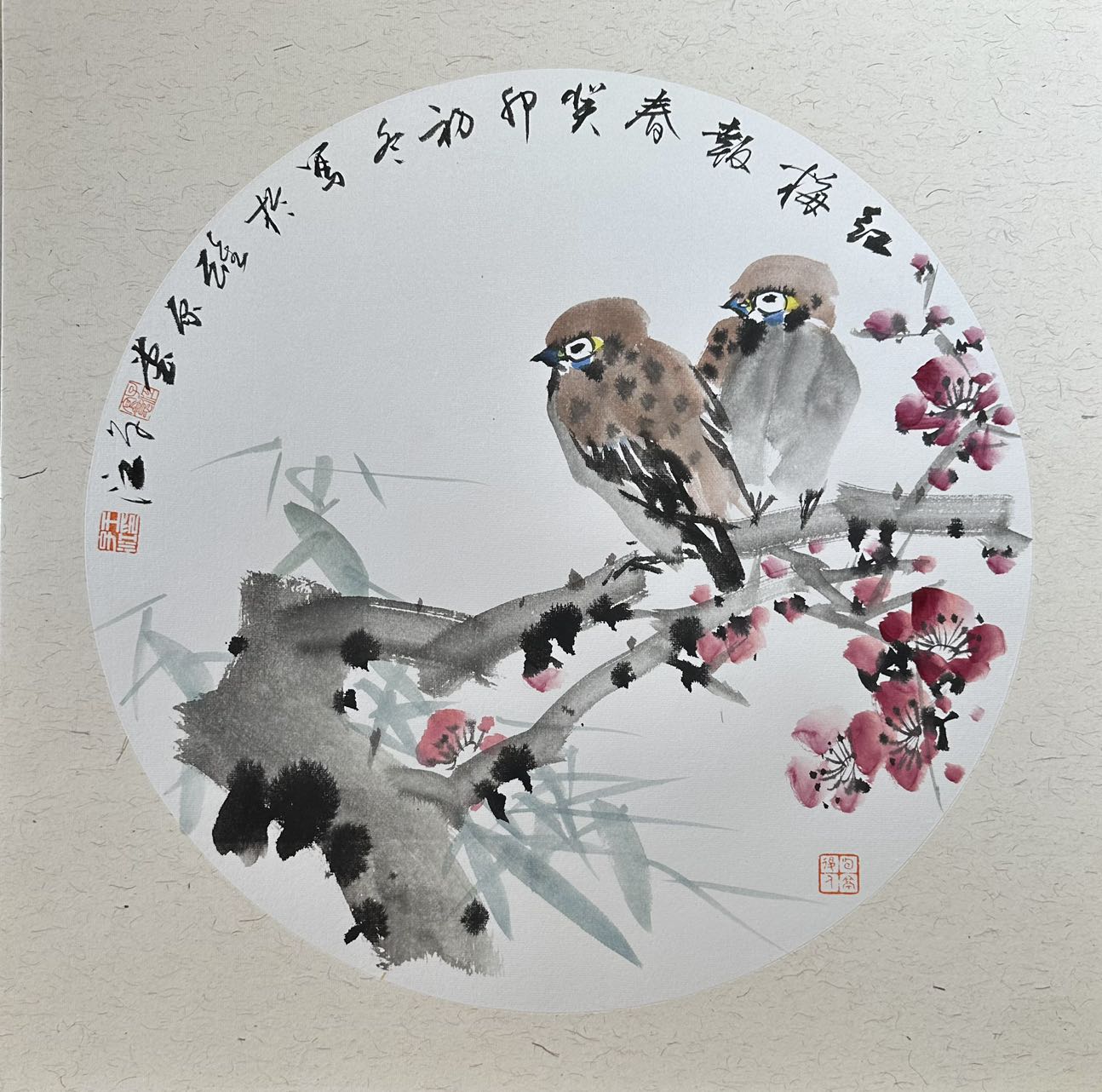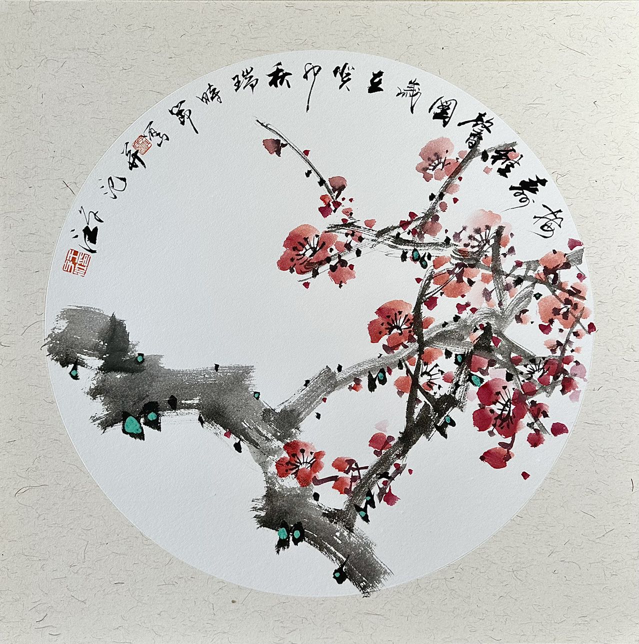 34)《紅梅報春》(50 x 50 cm)墨彩画