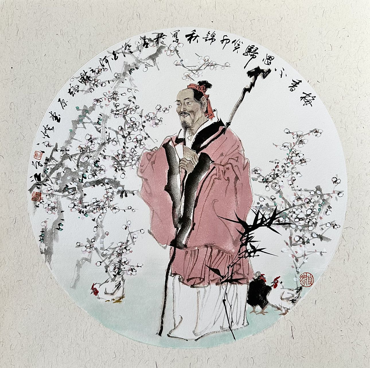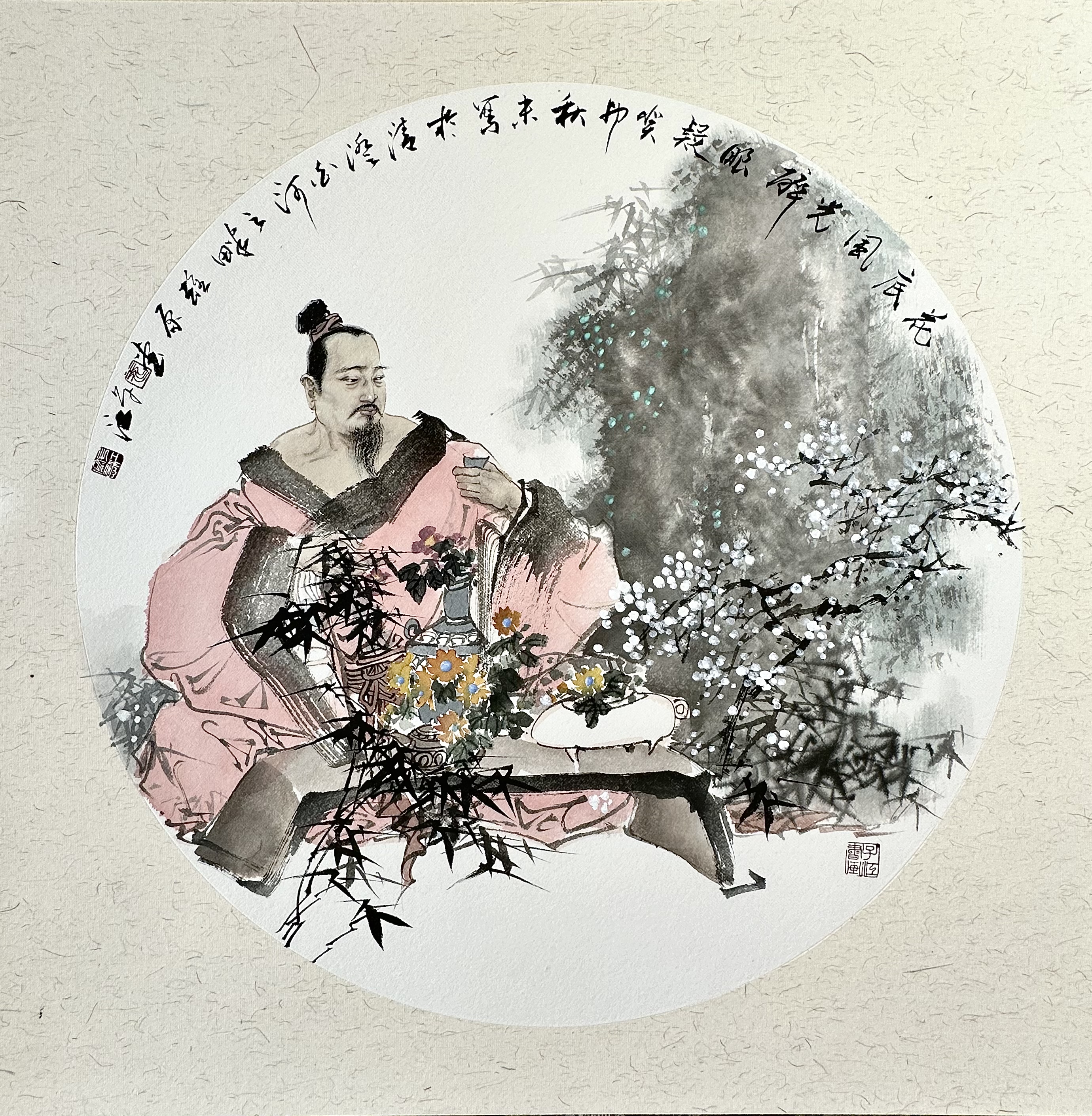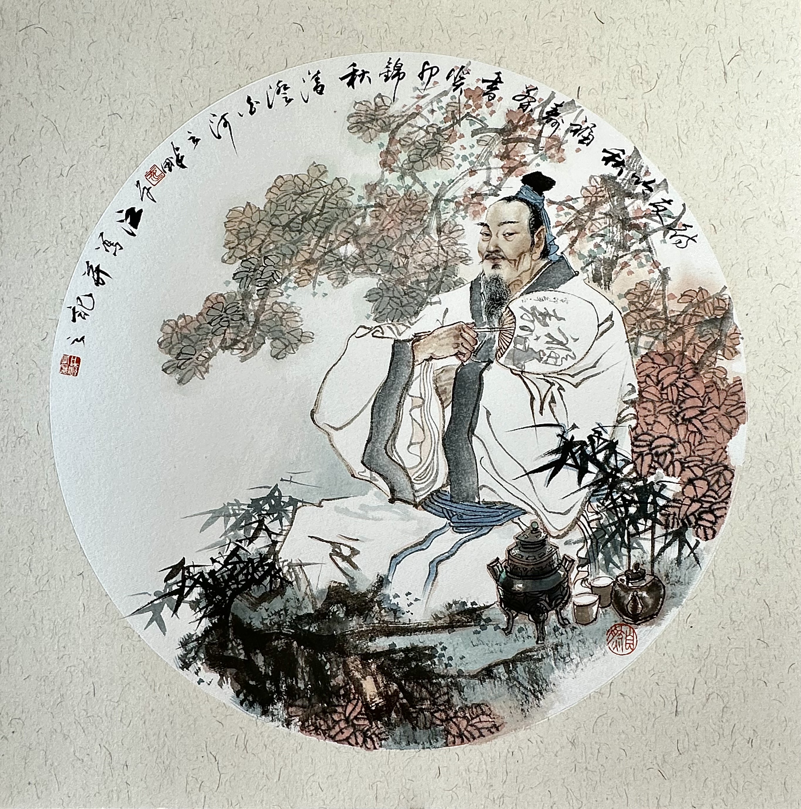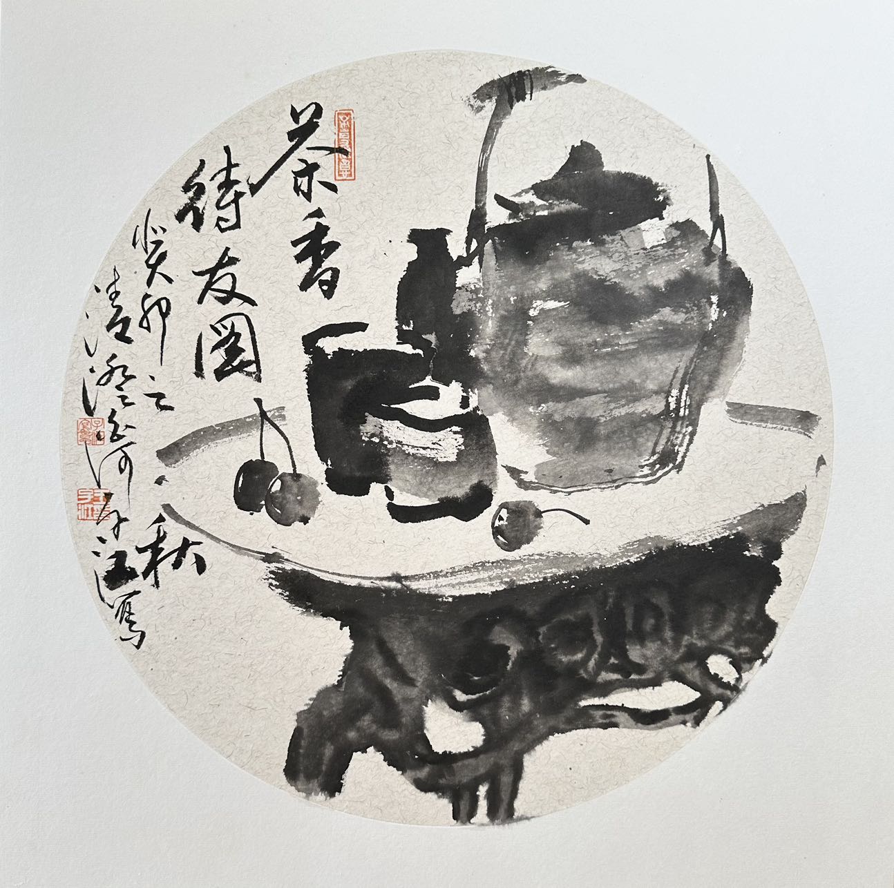 15)《待友吟秋福壽茶香》(50 x 50 cm)墨彩画