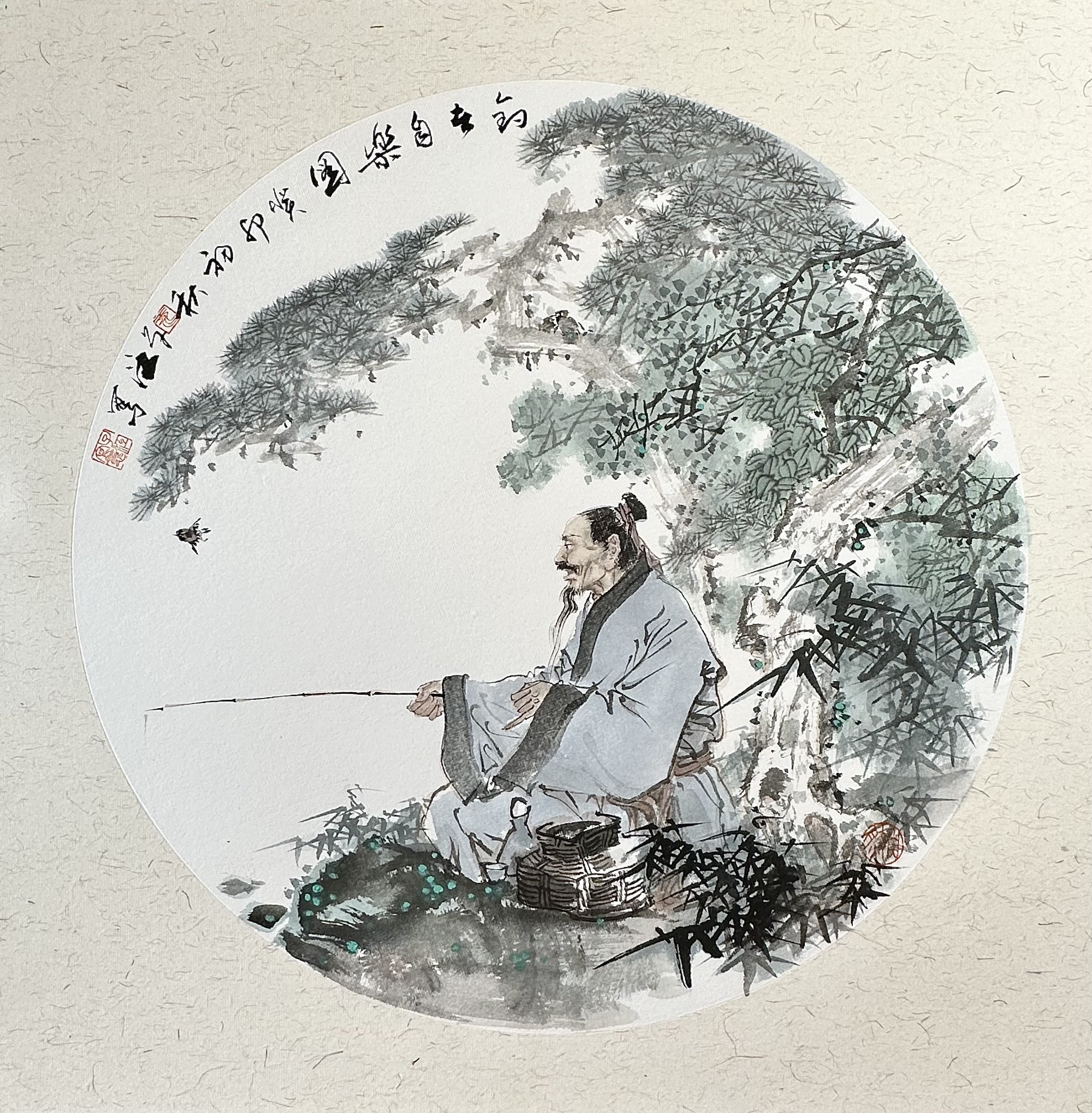 17)《釣者自樂》(50 x 50 cm)墨彩画