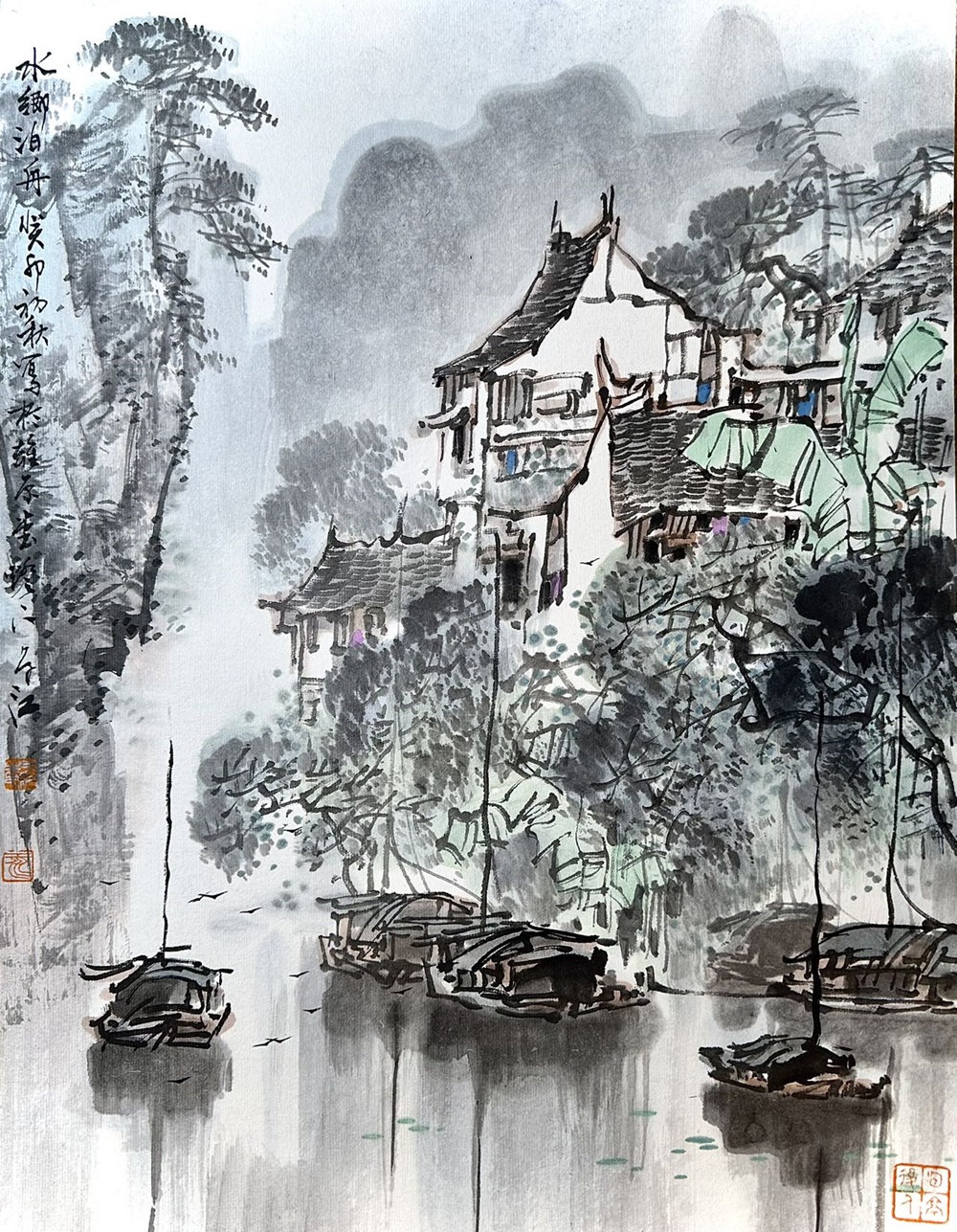 20)《水鄉泊舟》40.5x31.5cm  墨彩画