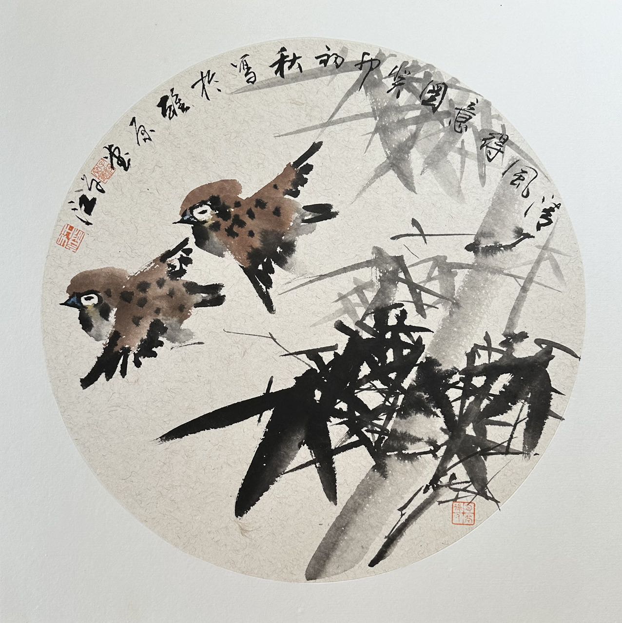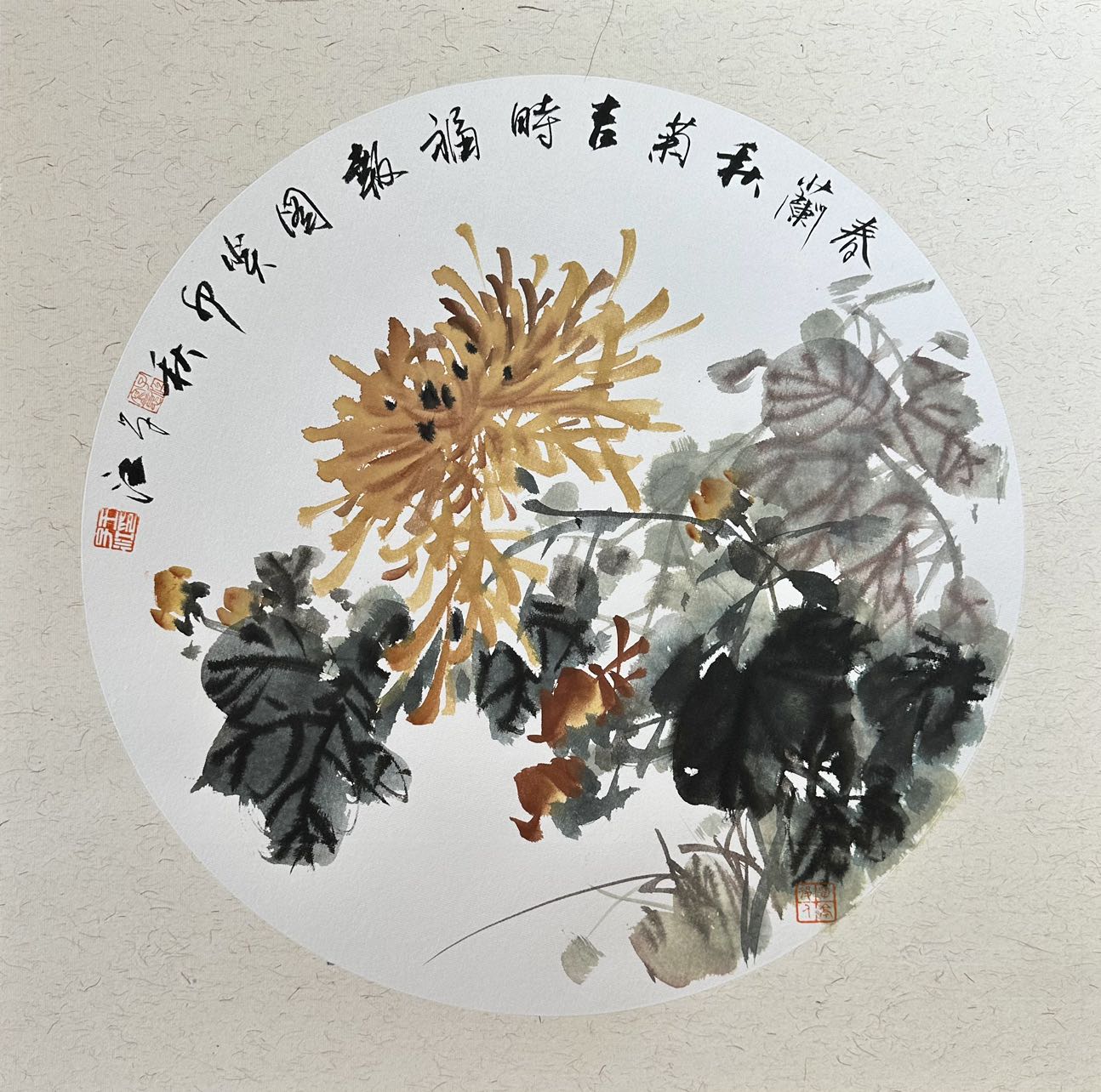 32)《春蘭秋菊·吉時福報》(50 x 50 cm)墨彩画
