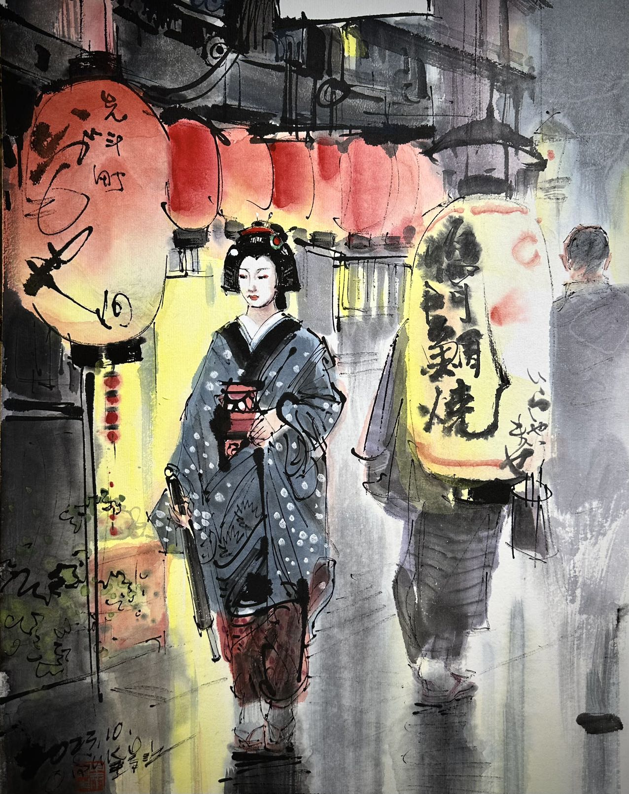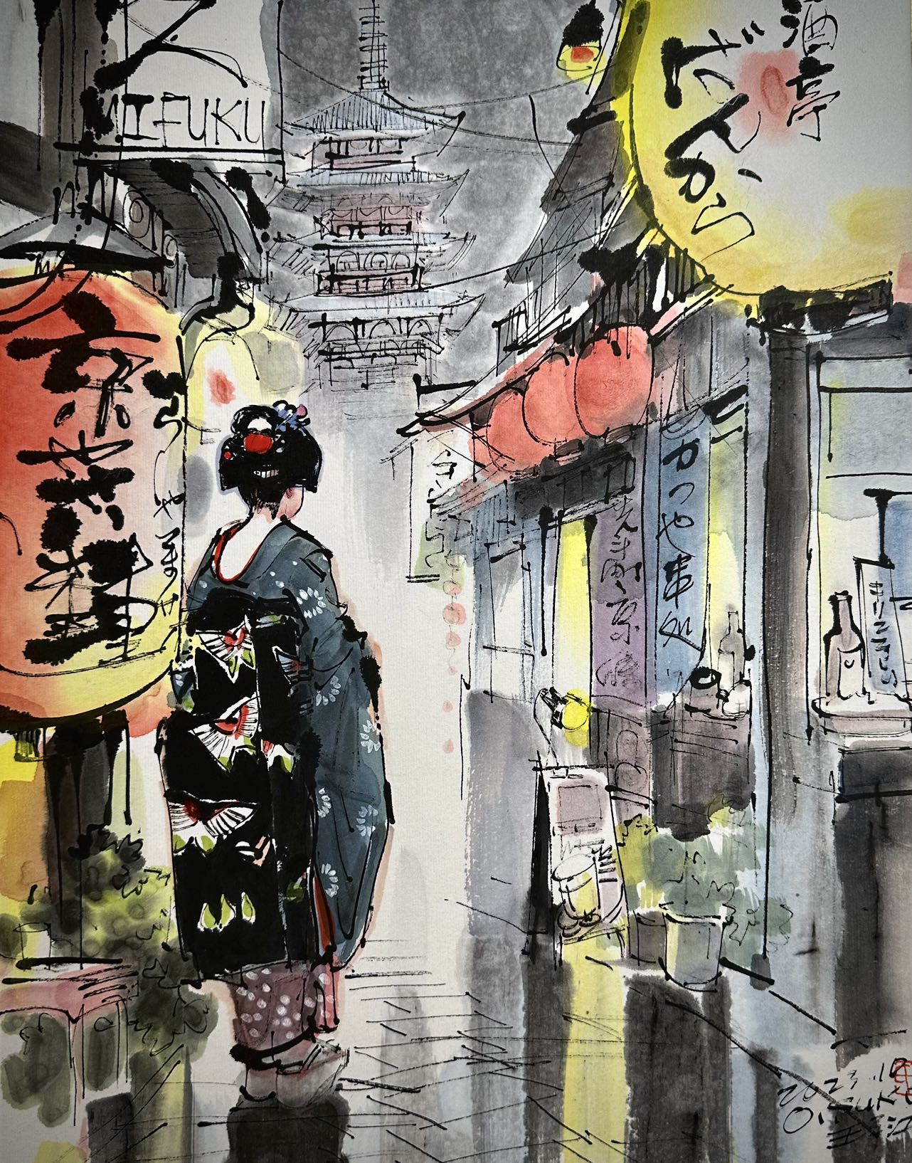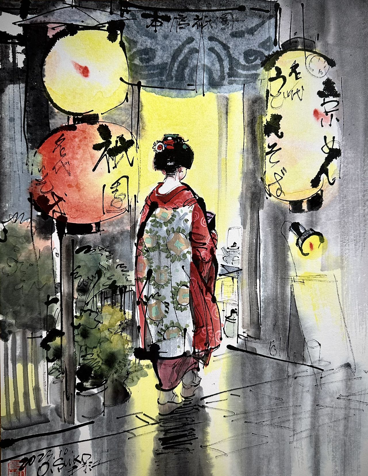 42)《京都風情寫生》(32 X41cm)墨彩画