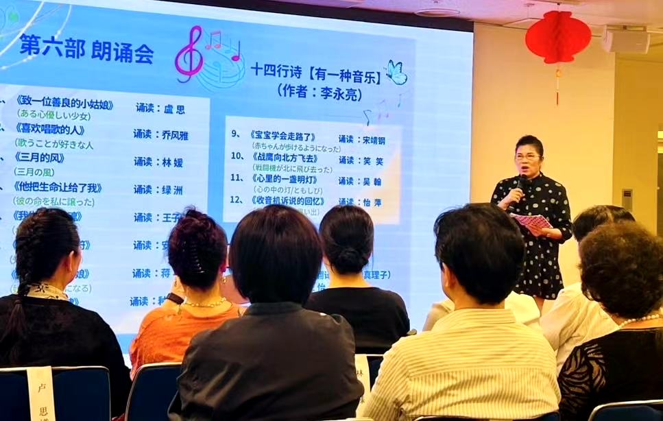 第六部十四行诗以“音乐”贯穿12首诗。其中《喜欢唱歌的人》、《收音机诉说的回忆》、《带来光明的音符》、《生死恋的旋律》,题目就明确显示了音乐主题。《外婆的澎湖湾》、《乡间小路》、《同一首歌》……在诗中这些经典歌曲响起了旋律,唤醒了我们的记忆和曾经的梦想。而在其它的诗中,字里行间常常出现“旋律”、“歌谣”、“伴奏”、“天籁之声”、“收音机声”,甚至“警报声”,这些表现音乐的词汇连接着一个个生动感人的故事,阅读中我的耳边仿佛响起了贝多芬的《致爱丽丝》,阿炳的《二泉映月》,还有开启新人生的《婚礼进行曲》以及表达离别情的《送别长亭外》……这些名曲让诗中人物共鸣,让诗与读者共鸣。今天这些音乐回旋在这个朗诵会的舞台上。