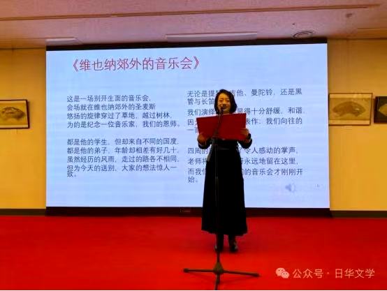 李永亮的十四行诗《维也纳郊外的音乐会》的画面感极强,仿佛一幅动态的印象派画卷,在听众的脑海中徐徐展开。诗人在语言中编织出的“巨大画面”,不仅是视觉的,更是听觉、触觉与情感的综合呈现。这种多感官的交织使得诗歌超越了单一的语言媒介,接近于音乐本身的多维表达。安格女士的朗诵进一步放大了这种效果:她的嗓音如清泉流淌,时而激昂,时而低回,将诗句化为音符,并随着她时而低垂、时而飞扬的赋予表情的眼眸的变化、在听众心中激起层层涟漪。