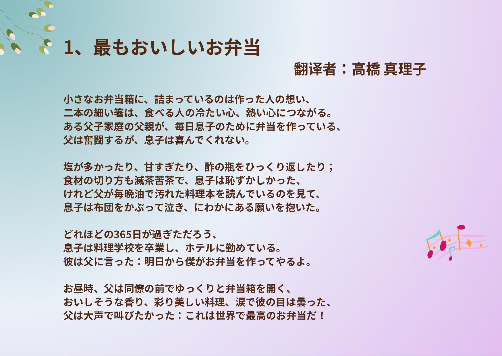他对父亲说:明天开始我要为你做盒饭。